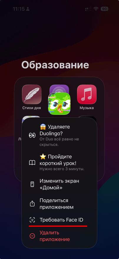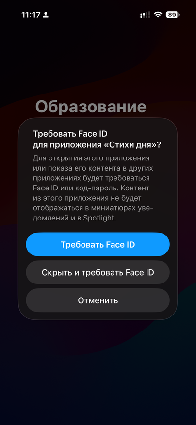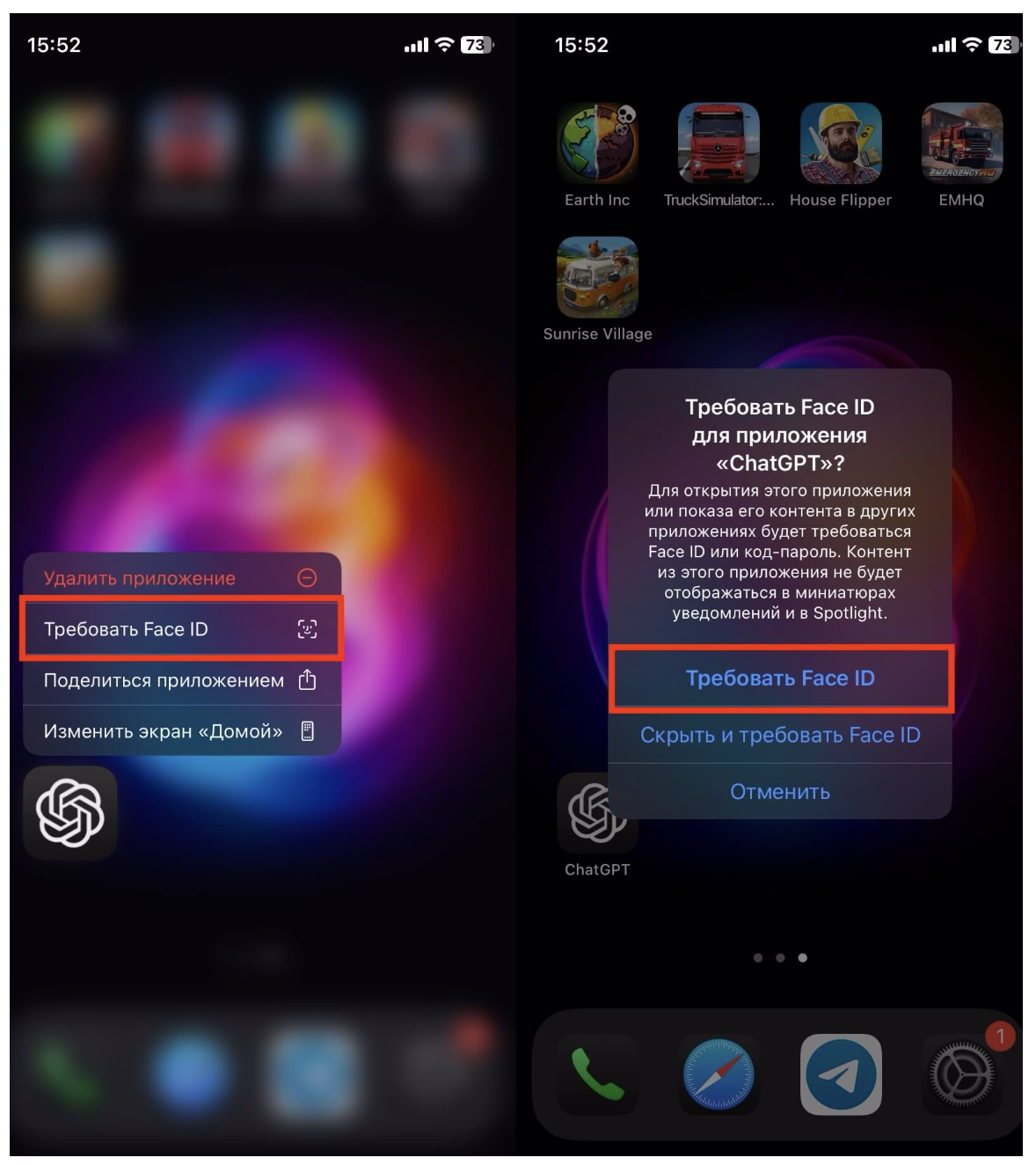 Бывают ситуации, когда иконка пусть остаётся на виду, но лишним глазам внутрь лучше не попадать. Для этого в iOS 18 есть отдельный режим — блокировка приложения по Fаce ID или Touch ID.
