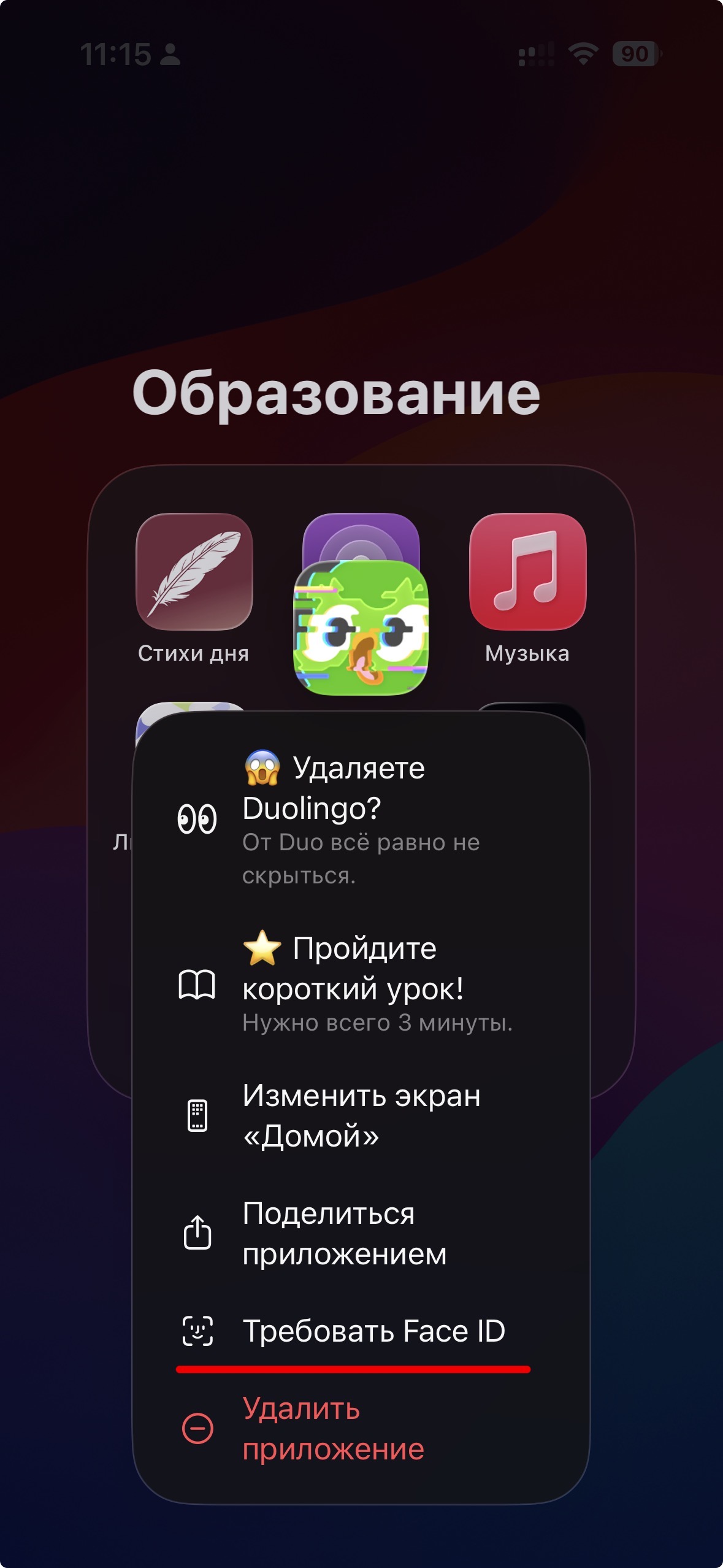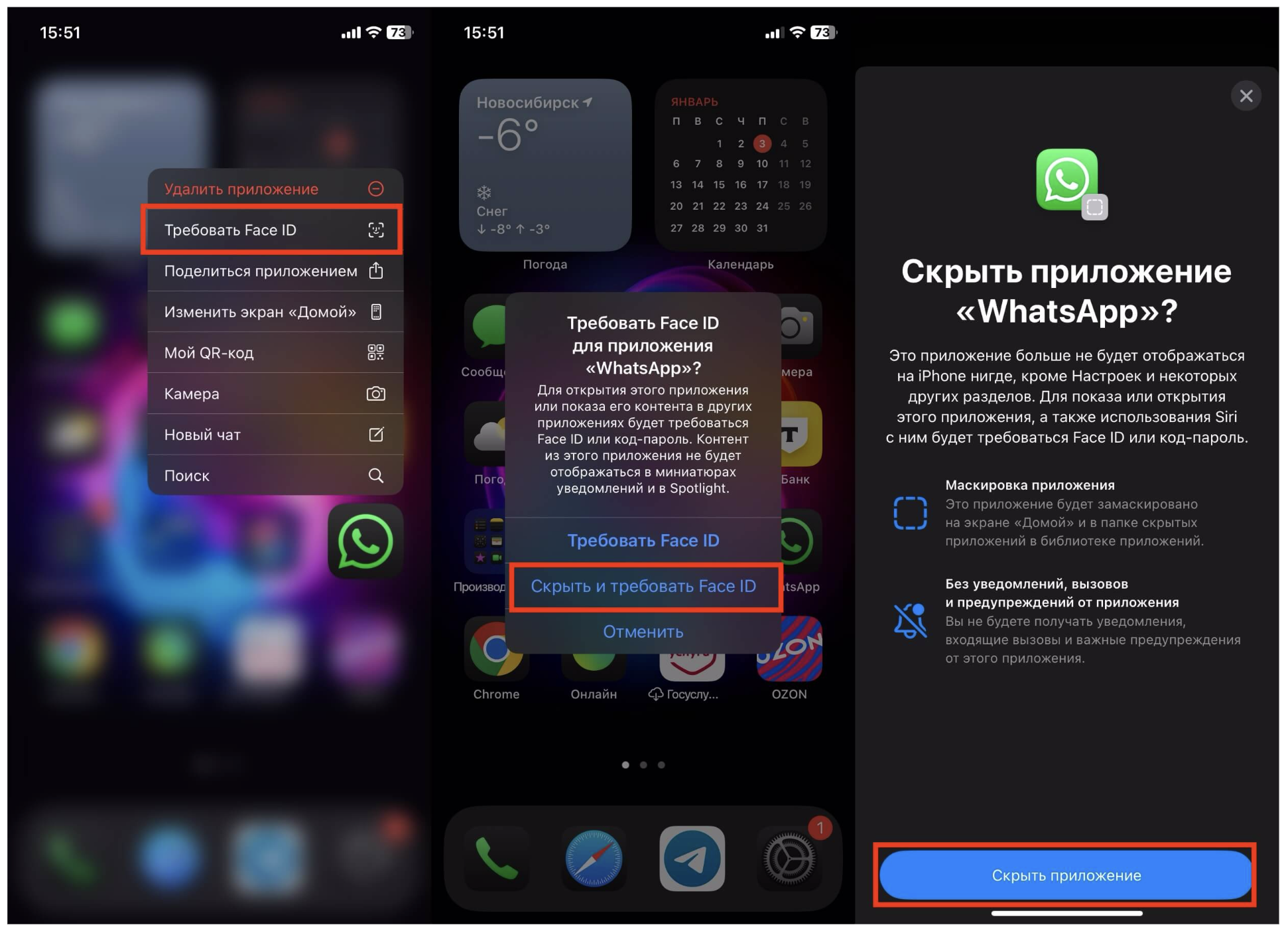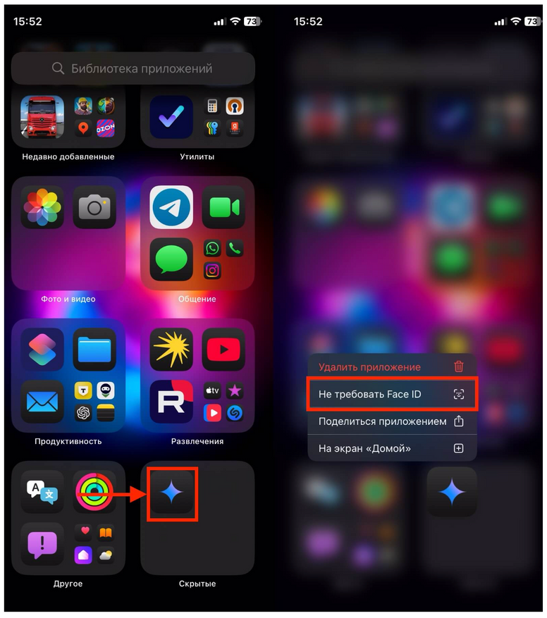 Если в меню есть только пункт «Требовать Fаce ID / Touch ID» без слова «Скрыть», такую программу спрятать нельзя — её можно только заблокировать.