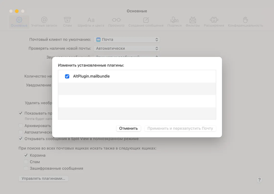 - Теперь открываем «Почту» → «Настройки» → «Основные» → «Управлять плагинами», отметьте AltPlugin. mailbundle, перезапустите «Почту».