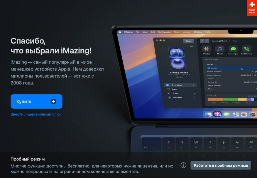 iMazing — настольная программа от стороннего разработчика. Она помогает делать резервные копии, смотреть файлы, переносить данные и переустанавливать iOS. Работает на Windows и macOS. Нужен компьютер и кабель. Для переноса приложений хватает бесплатной версии.