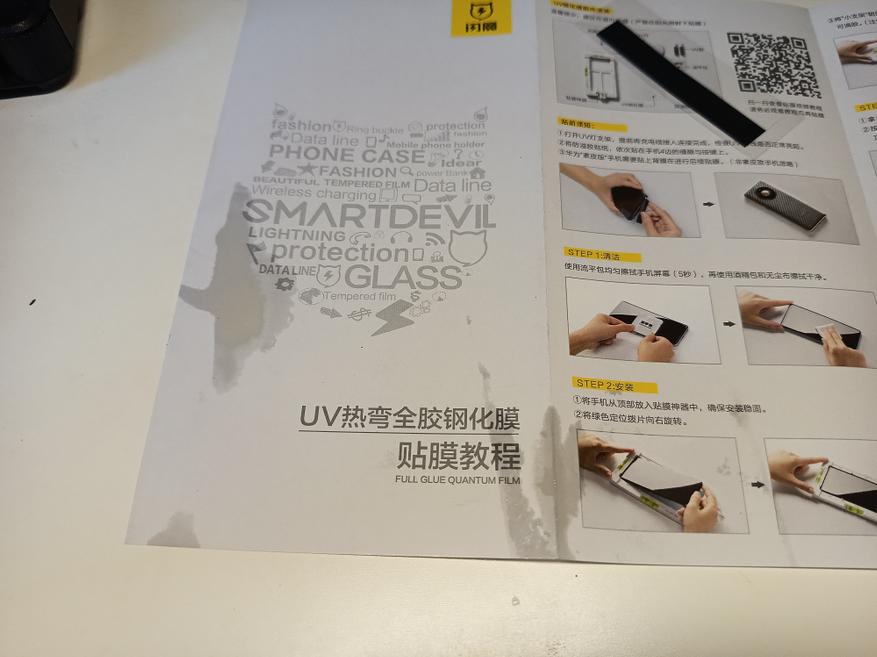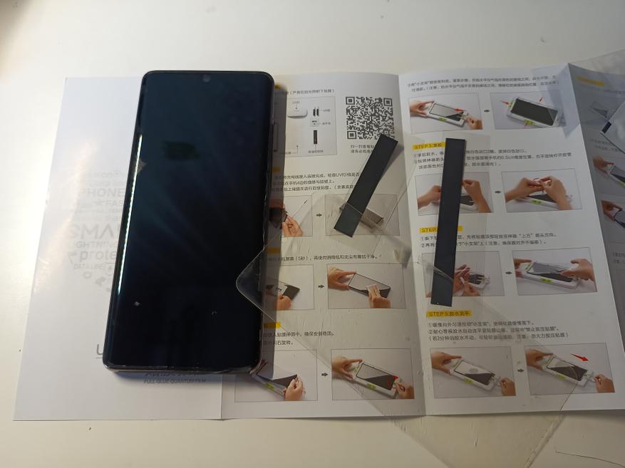 На странице товара есть видеоинструкция по установке. В комплекте стекла ее нет, но есть в упаковке УФ-лампы, с помощью которой происходит установка. Использование клея, УФ-лампы, стикеров для заклейки портов и динамиков — это все не очень сподвигало к началу процесса, так как при ошибке я бы остался без стекла на телефоне. Второго запасного у меня не было. В итоге все получилось.
