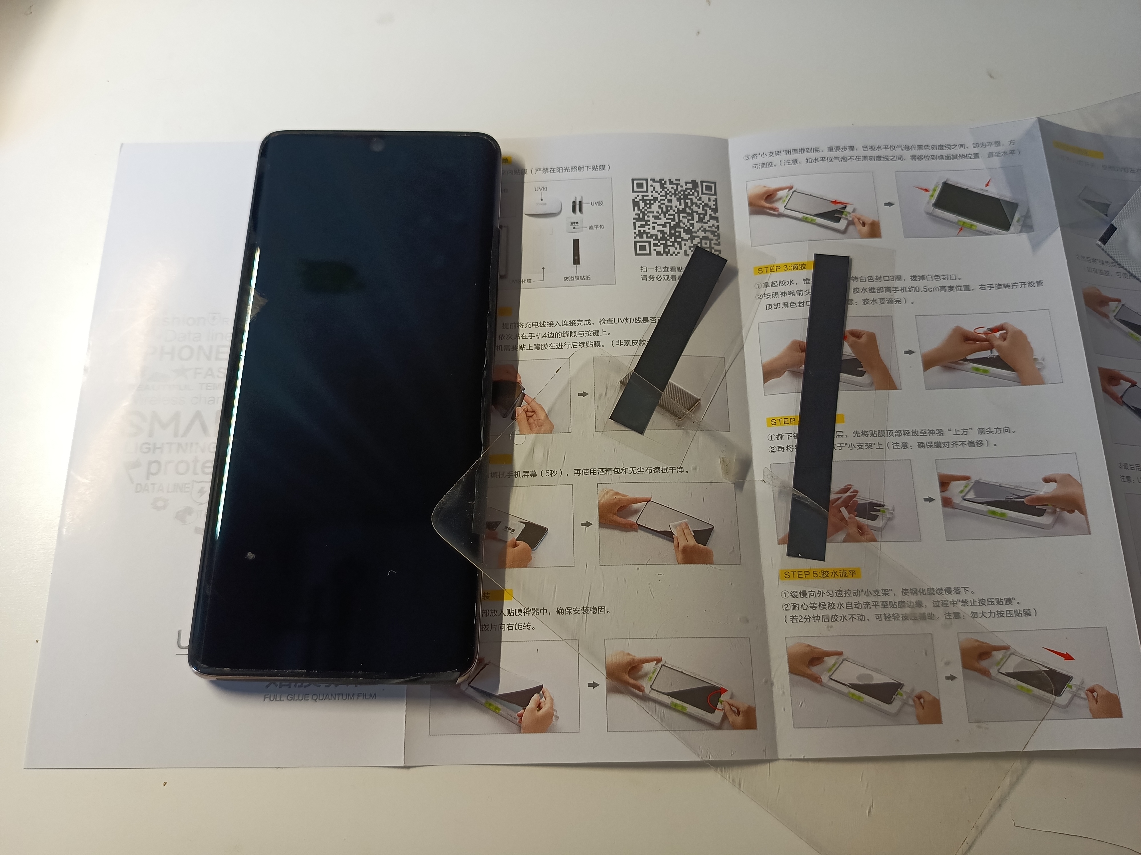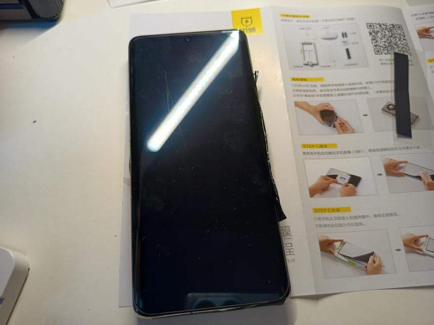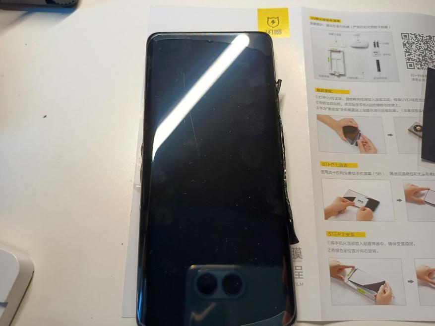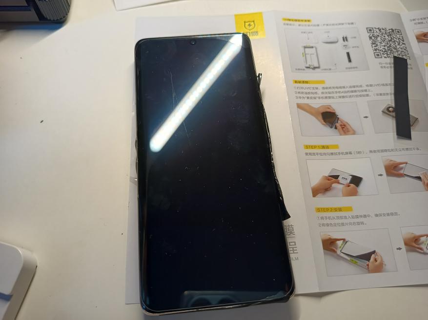 Для Huawei P50 Pro купил стекло без подставки с УФ лампой. Ее приобрел со стеклом для Xiaomi 12X, но, как потом удивился, что подставка под Huawei P50 Pro не подходит (действительно, почему я надеялся, что она подойдёт?!). В таких ситуациях думаешь, хотел сэкономить, а получится ещё хуже. Риск есть всегда, но останавливаться мне уже было поздно. На фотографиях ниже показано, как выглядел экран с пленкой до и со стеклом после.