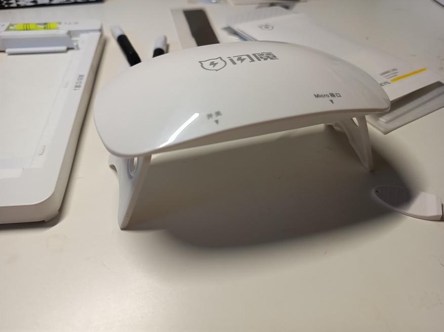 У лампы есть ножки, на высоте которых ее надо проводить по новому стеклу для склейки. Внутри нет аккумулятора, работает она от сети или повербанка.