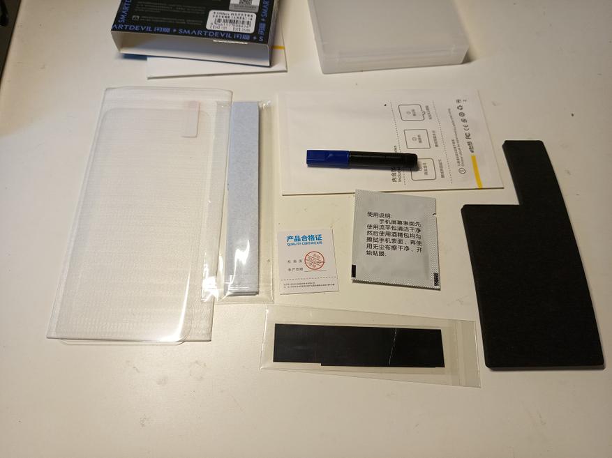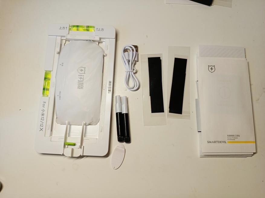 Комплект УФ-лампы для Xiaomi 12X содержит, в моем случае, два стекла, поэтому каждого аксессуара в нем по две штуки: тюбик с клеем, стекло, защитная пленка по бокам, влажная и сухая салфетки, липучка и кабель microUSB для питания лампы.