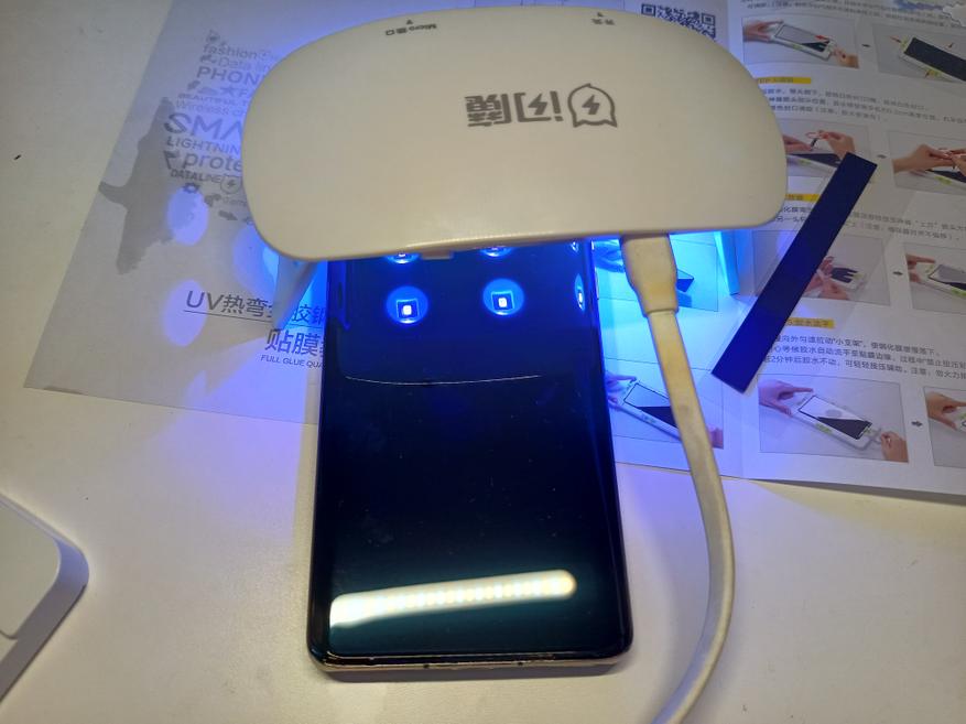 - Оторвать защитные пленки по бокам телефона и провести УФ-лампой по ним в течение 30 с на каждой стороне