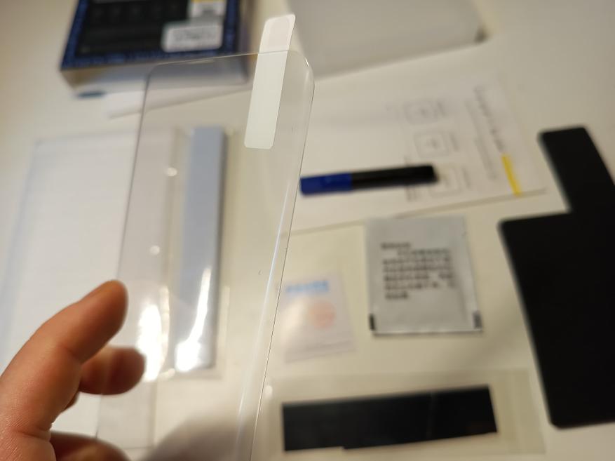 По итогам затвердения видно, что часть клея вылилась, поэтому стоит что-то подкладывать под него. В комплекте стекла есть другие элементы (белого цвета), которыми можно закрыть бока смартфона, чтобы не пролился на них клей. В своей установке я их не использовал.