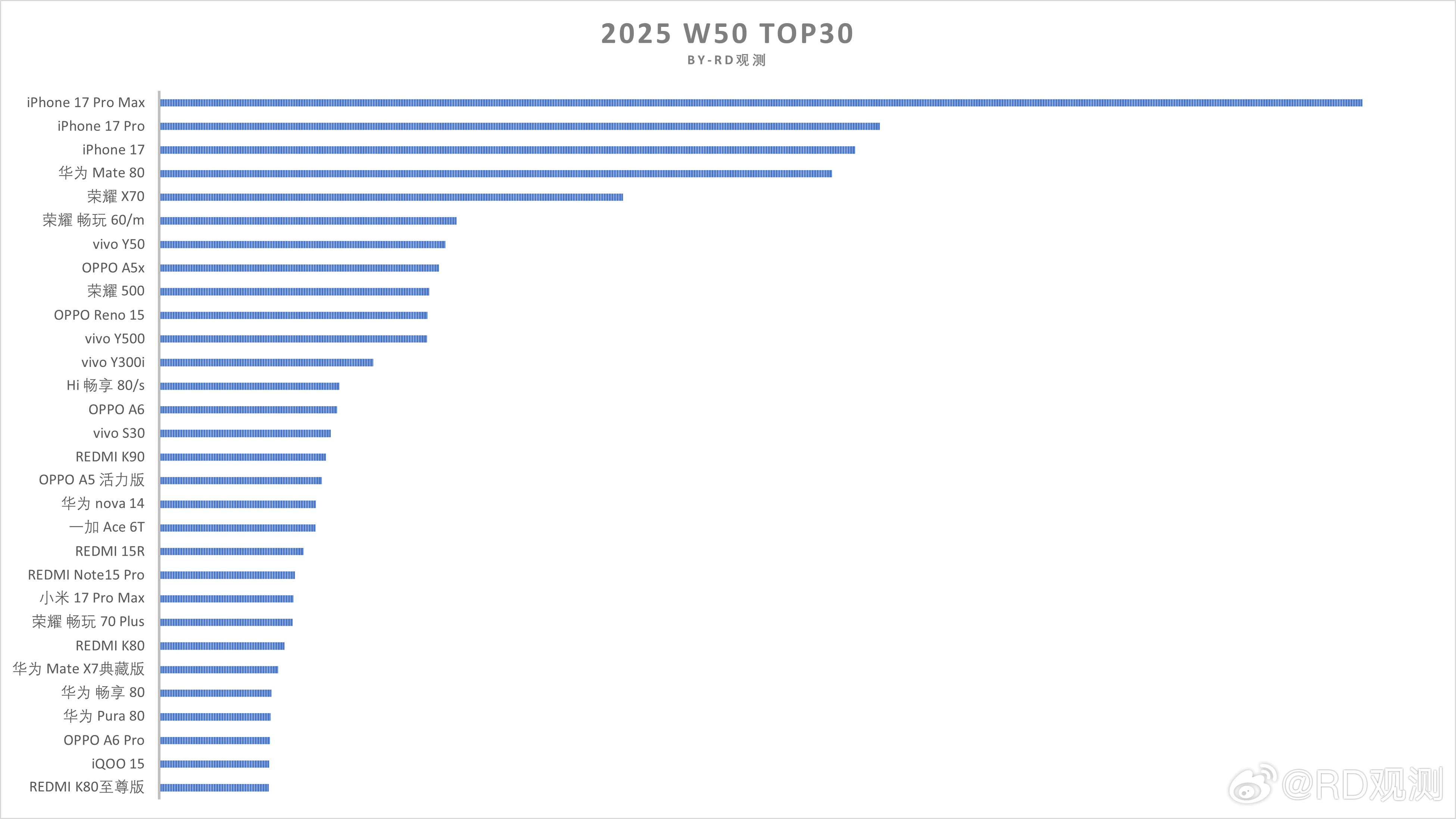 Каждую неделю блогер RD Observation публикует список тридцати самых популярных смартфонов на китайском рынке. Актуальный отчёт, посвящённый 50 неделе 2025 года примечателен своими лидерами: первые три строчки занимают актуальные Айфоны, причём с большим отрывом лидирует самый дорогой из них — iPhone 17 Pro Max. На втором месте расположился компактный Pro, следом идёт базовый iPhone 17, а вот сверхтонкий Air в рейтинг вообще не попал: из-за отсутствия слота для физической SIM-карты его продажи в Китае оказались слишком низкими.
