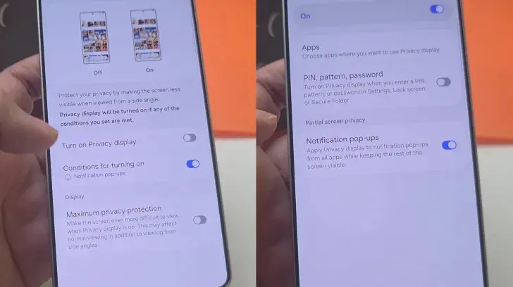 В Samsung Galaxy S26 Ultra, официальная презентация которого назначена на 25 февраля, функция Privacy Display предусматривает несколько режимов работы. Помимо полного затемнения экрана для бокового обзора, доступен режим частичного затемнения — он скрывает только всплывающие уведомления, оставляя остальное содержимое видимым. Пользователь может назначить активацию функции для отдельных приложений. Также предусмотрено автоматическое включение при вводе PIN-кода, пароля или графического ключа на экране блокировки и в защищённой папке. При разблокировке с помощью биометрии — отпечатка пальца или распознавания лица — функция деактивируется.