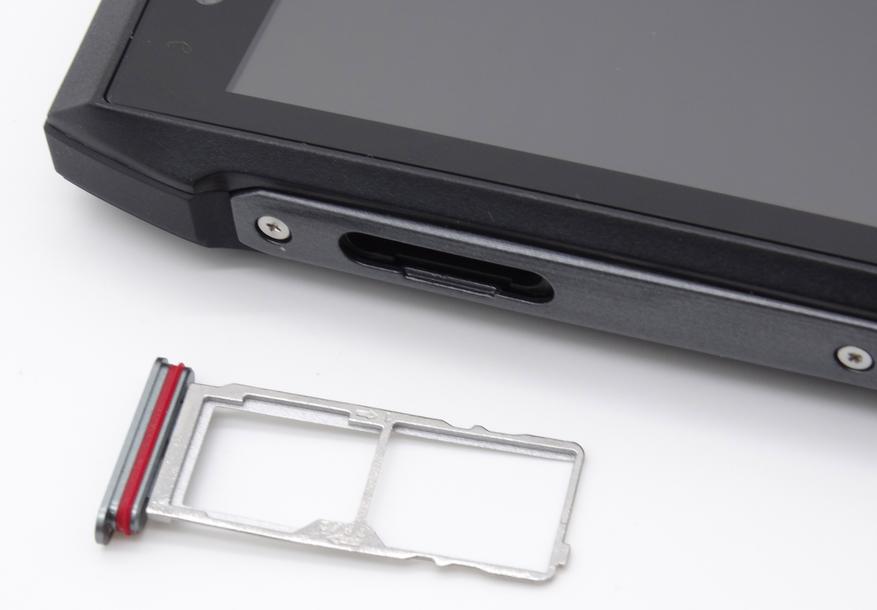 На левой стороне находится нестандартный комбинированный лоток для одной СИМ-карты формата micro и карты памяти microSd, либо для СИМ-карт micro и nano. Извлекать лоток проще всего медиатором, хотя и ногтем большого пальца это удаётся сделать быстро. Также стоит отметить наличие, по ощущениям, металлических вставок по бокам – каждая из них прикручена с помощью трёх винтиков.