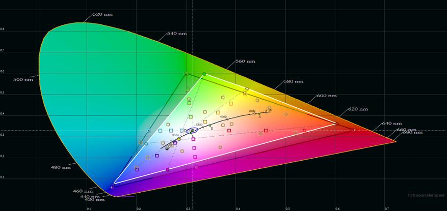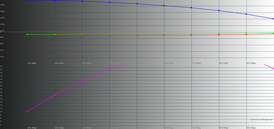 Цветовой охват смартфона далёк от треугольника sRGB — оттенки будет менее насыщенными, чем должны быть. Точки серого клина расположились далеко за радиусом DeltaE, что создаёт паразитные оттенки в сером цвете. Цветовая температура, в свою очередь, сильно завышена, поэтому будут преобладать холодные оттенки.