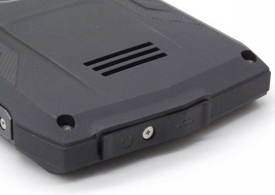 На верхней грани ничего нет, а снизу — прикрытые съёмной резиновой заглушкой разъёмы 3.5 мм и micro USB. Заглушка удобна тем, что легко поднимается вверх, а это способствует быстрой вставке кабеля или наушников. Но есть и большой минус в том, что разъёмы слишком глубоко утоплены в корпус, поэтому придётся искать переходники для наушников (если его нет в комплекте или он потерялся, либо сломался) и для подключения устройств через USB-OTG. Также нужен будет кабель с удлинённым штекером (в комплекте именно такой), либо тоже какой-то переходник.