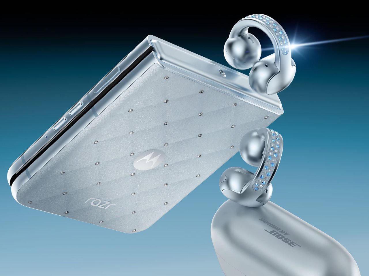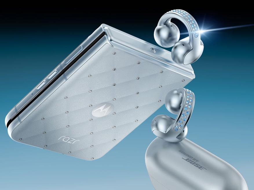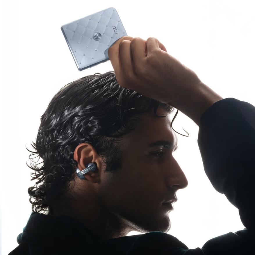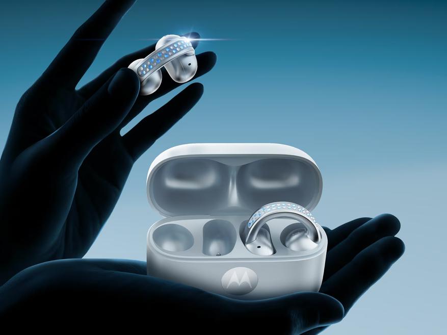Дополняющие комплект наушники Moto Buds Loop также декорированы кристаллами, встроенными в заушные крепления. Технические характеристики включают динамики, разработанные совместно с Bose, поддержку пространственного звука и автономность до 37 часов.