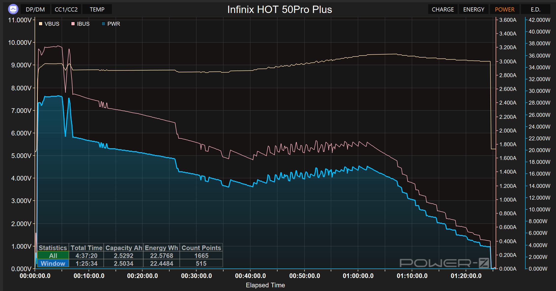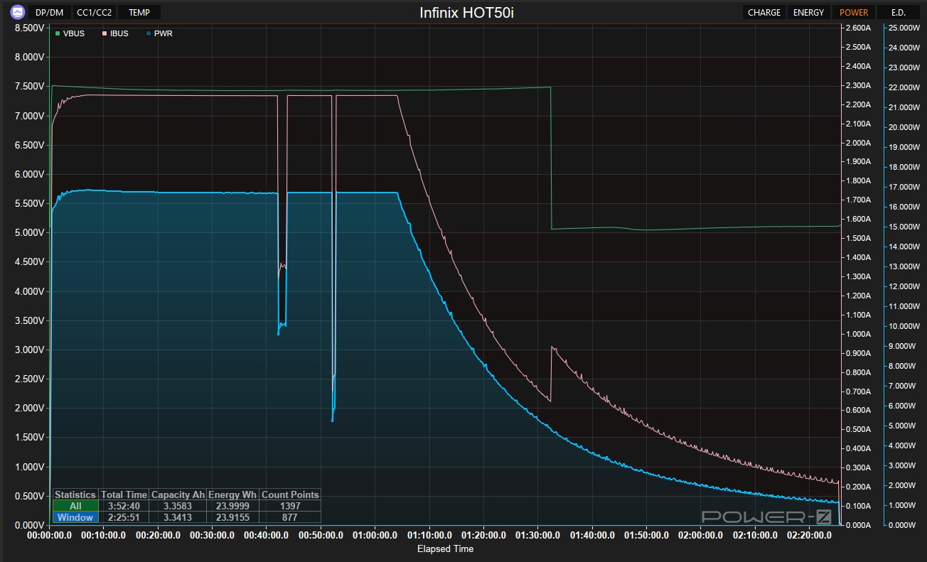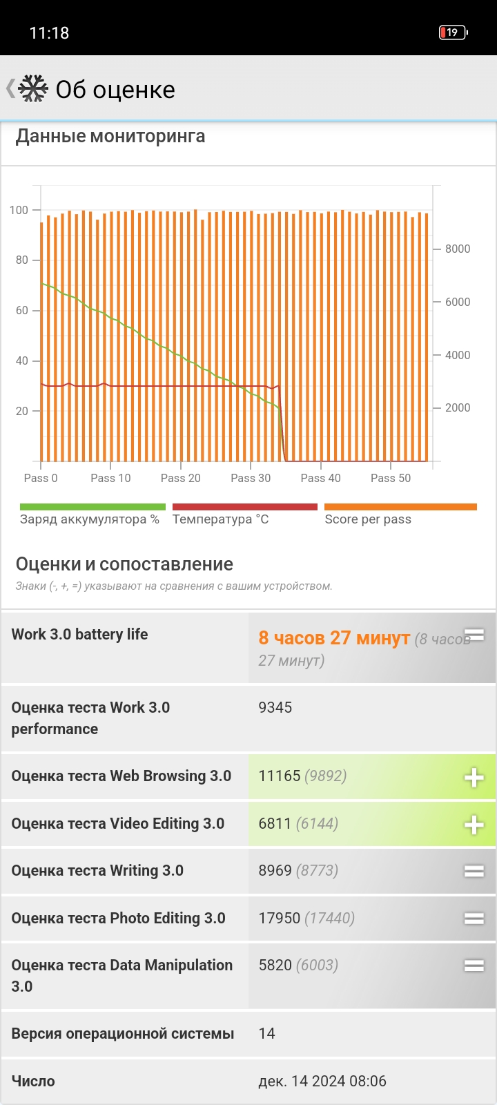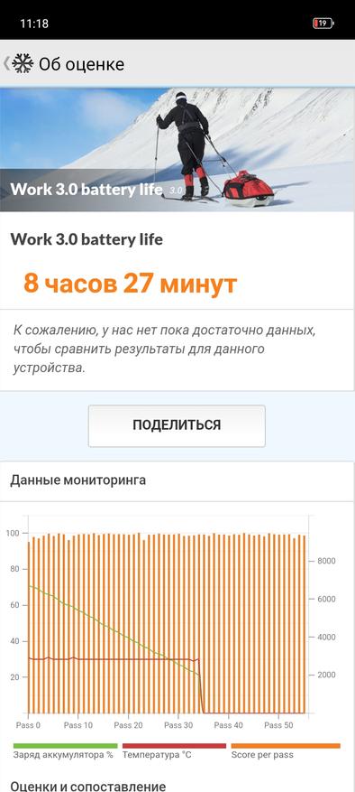 Для проверки автономности запустим тест PCMark на максимальной яркости. Несмотря на колоссальную разницу в чипсетах, итоговый результат практически идентичен: слева HOT50i, справа HOT50 Pro+: