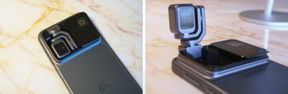 Главная особенность Robot Phone — уникальный карданный механизм, выдвигающийся из задней панели корпуса. На изображениях можно увидеть этот механизм как в сложенном, так и в развернутом состоянии. Важно отметить, что для активации камеры необходимо сдвинуть защитную панель вправо, которая скрывает сложный шарнирный механизм.