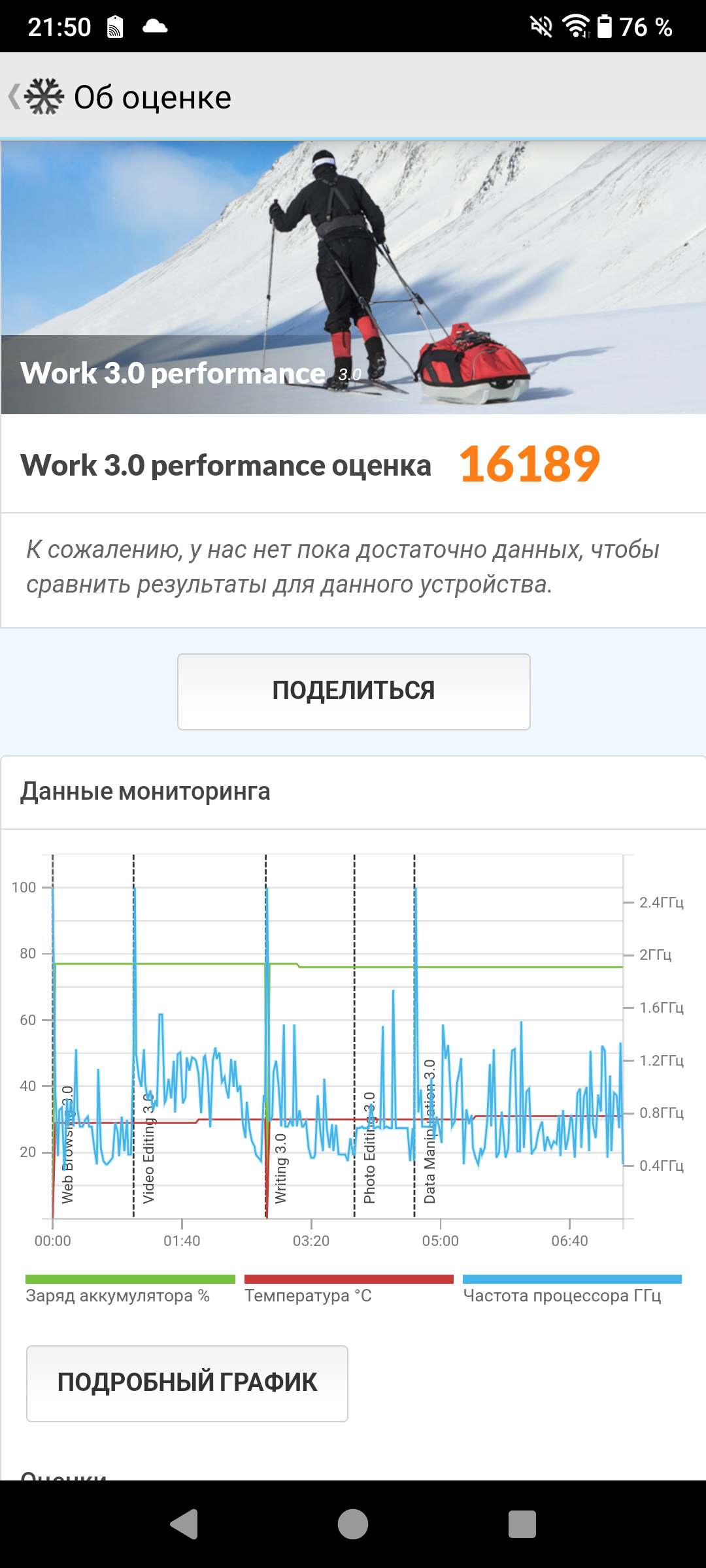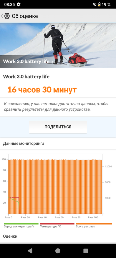 Собственно говоря, если еду в лес или на рыбалку — то этот смартфон всегда со мной. Конечно, дорогой смартфон вообще нет смысла брать на природу — этот и фотографирует нормально, и батарею держит, и потерять не жалко. Да и, определенно, разбить будет сложнее чем всякие новомодные модели. Что касается времени работы от аккумуляторной батареи, то тут более или менее в порядке. Заявленная автономность — это более 600 часов в эконом режиме и в ожидании. Активное непрерывное использование, например, просмотр видео — часов 8. Практически полтора дня «держит» с обычным использованием — немного звонков, немного навигатора, что-то посмотреть в интернете. Тест PCMark, к слову, показал 16 с половиной часов непрерывного использования.