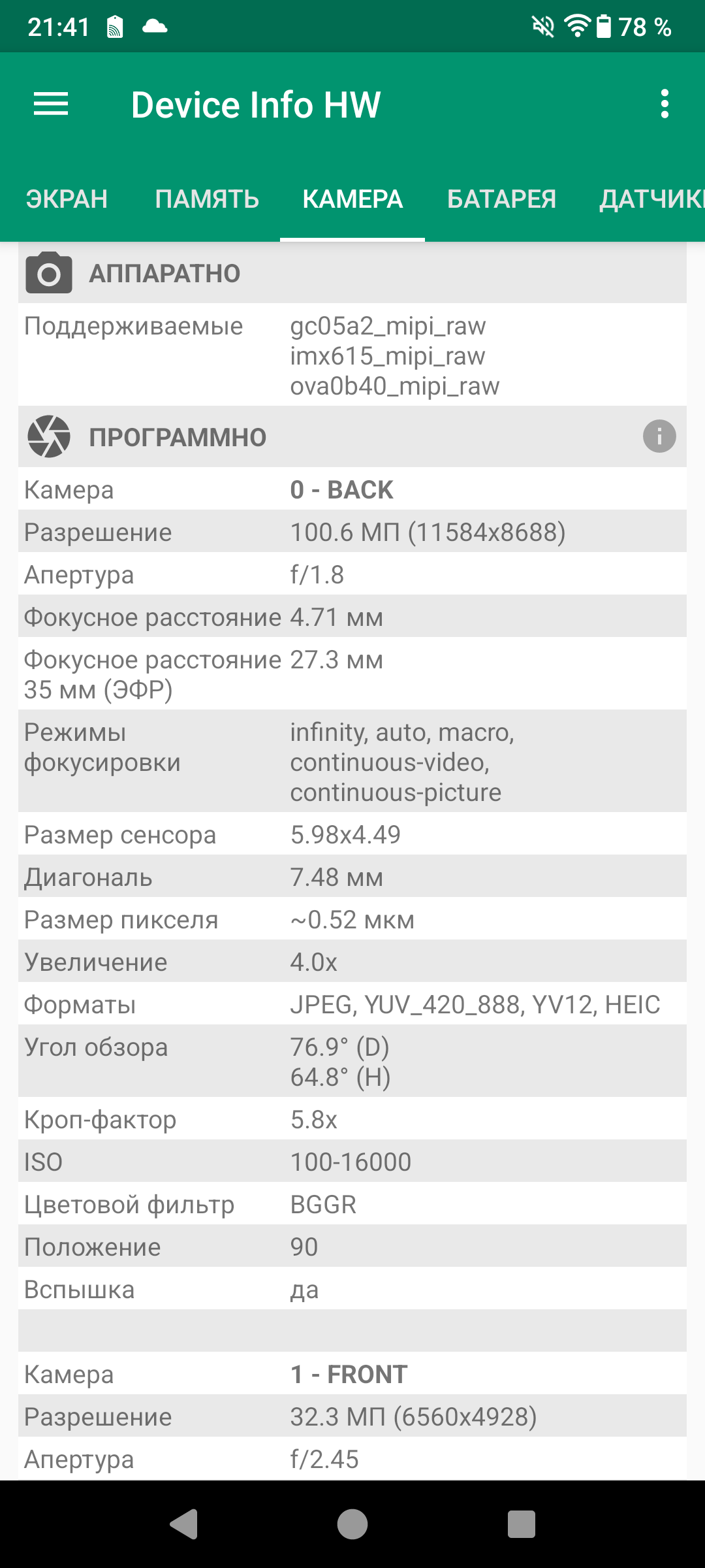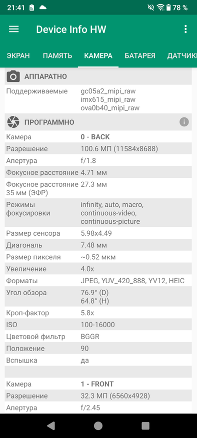 Проверил разрешение снимков — все соответствует заявленным 100 Мп (в режиме хайрес), а также заявленным 32 для фронталки. В данном случае обошлось без обмана в плане разрешения и без интерполяции.