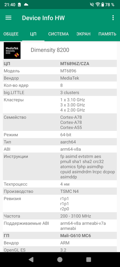 | Процессор | Mediatek Dimensity 8200, GPU Mali-G610 MC6 |