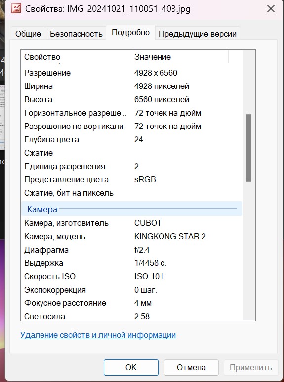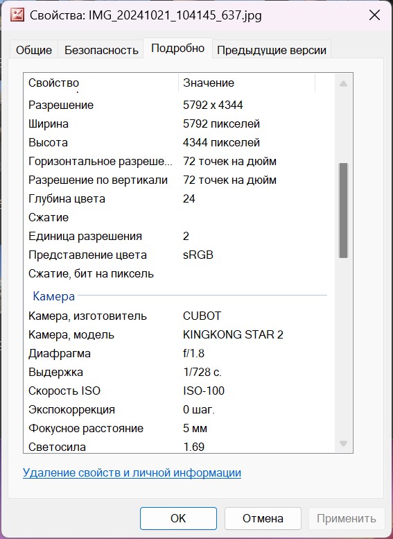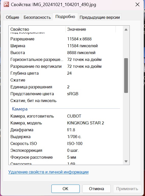 Свойства фотоснимков