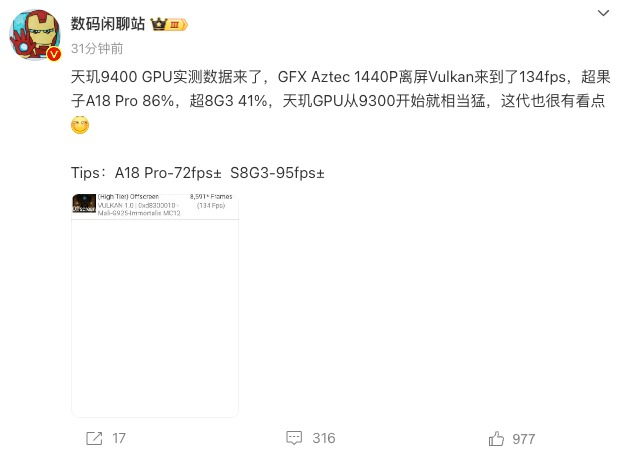 Процессор MediaTek Dimensity 9400 представляет собой новый шаг в развитии мобильных чипсетов. Согласно информации, предоставленной одним из источников, тестирование Dimensity 9400 в бенчмарке GFX Aztec 1440P Offscreen Vulkan показало результат 134 кадра в секунду. Это на 86% выше показателей Apple A18 Pro и на 41% больше, чем у Snapdragon 8 Gen3. Данный результат указывает на то, что графическая система нового процессора демонстрирует существенное превосходство над конкурентами, что потенциально может улучшить стабильность работы в играх и требовательных графических приложениях.