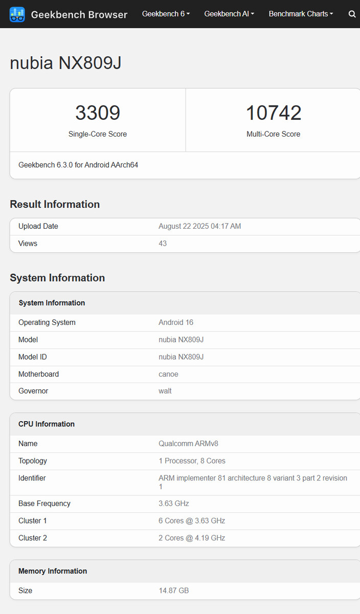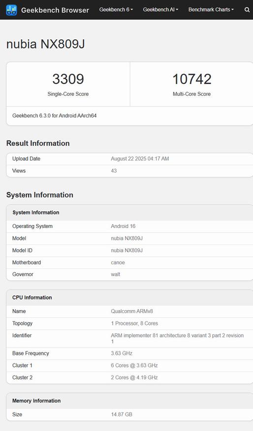 В базе данных Geekbench обнаружено устройство с модельным номером Nubia NX809J, которое, согласно схеме нумерации Nubia, является предстоящим игровым смартфоном RedMagic 11 Pro. Предыдущая модель RedMagic 10 Pro имела обозначение NX789J, что подтверждает преемственность нумерации.