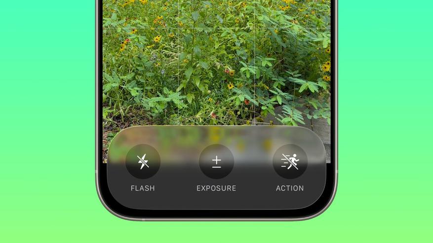 Многие элементы управления, ранее расположенные в верхней части приложения, теперь перенесены во всплывающие меню. Нажав на выбранный режим (например, «Фото»), пользователь получает доступ к дополнительным параметрам. Всплывающее меню выполнено в стиле Liquid Glass и содержит крупные кнопки для доступа к настройкам вспышки, Live Photo, таймера, экспозиции, стилей, соотношения сторон и ночного режима.