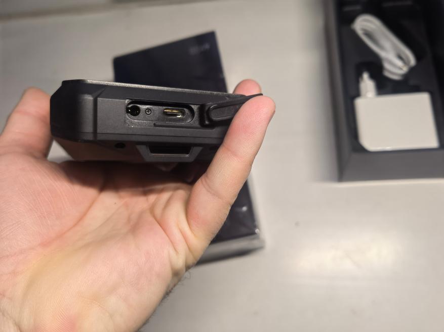 На следующих фотографиях показаны основные элементы, расположенные по бокам защищённого смартфона от 8849. Отпечаток пальца встроен в боковую кнопку, которая имеет небольшой люфт. С противоположной стороны находятся качелька громкости, две вспомогательные кнопки, на каждую из которых можно назначить до трёх действий, и сим лоток на на три карты одновременно. На переднем торце рядом с проектором есть инфракрасный порт для управления техникой через программу Zaza Remote. Под единственной заглушкой телефона скрывается порт USB-C 2.0 и разъем для наушников 3,5 мм.