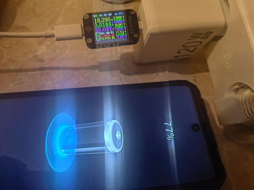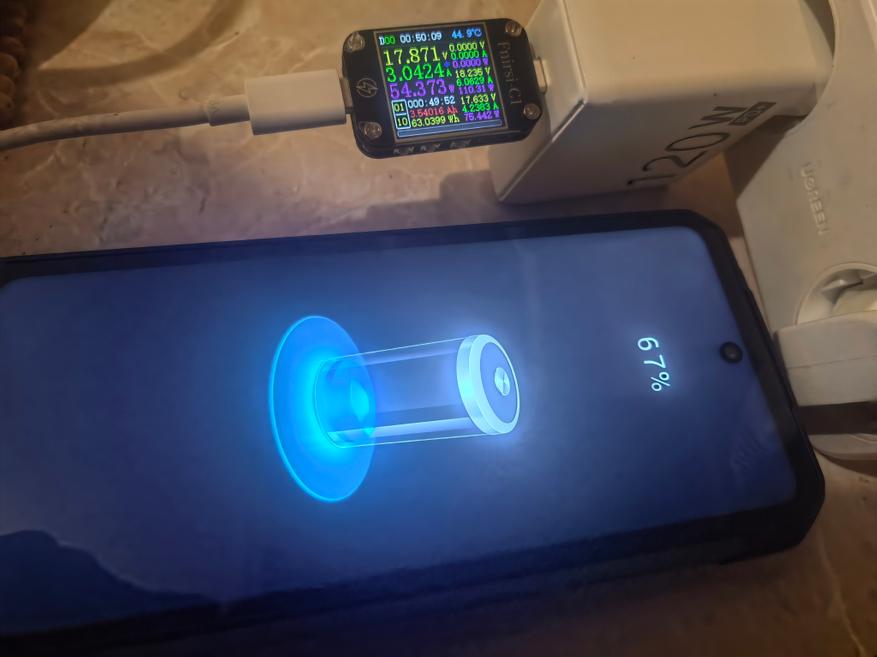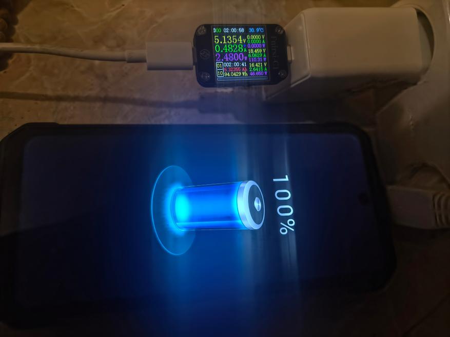 Телефон заряжается аналогично предшественнику 8849 Tank 3 (обзор здесь), достигая 100% за 120 минут. За 50 минут с нуля заряд составляет 67%, через 1 час — 77%. Итог составляет 5324mAh (94,0Wh). В тестах и обычном использовании (игры, интернет, текст, общение) Я разрядил модель за 3 дня, ни в чем себе не отказывая. На графике видно резкое падение заряда — это использование проектора в течение 1,5 часов, за которые было зрасходовано примерно 15% заряда аккумулятора. На полном заряде можно смотреть проектор в течение 10 часов. В случае 8849 Tank 2 (обзор здесь) полного заряда аккумулятора хватало бы на 8,3 часа.