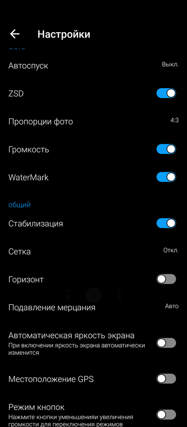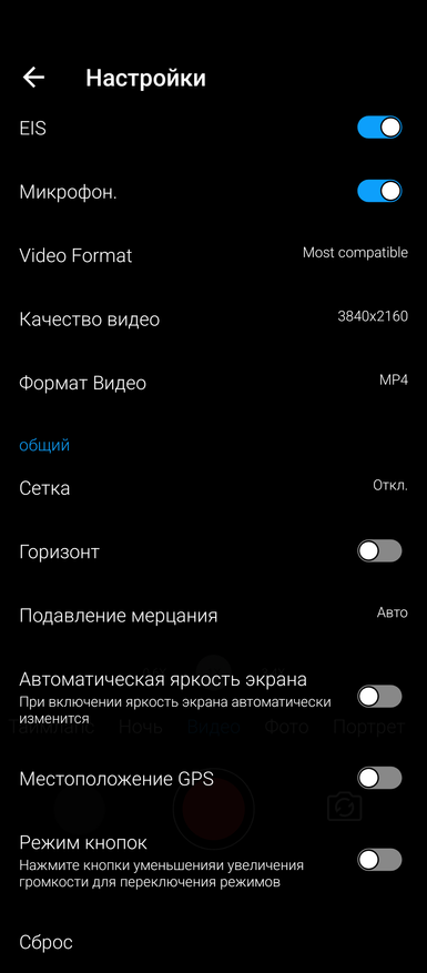 Настройки камеры показаны ниже. Выбрать разрешение фотографий в стандартном приложении «Камера» нельзя. Фронтальная камера поддерживает запись видео в 1080р и 30 fps, основная — 4К и 30 fps. При фотографировании можно включить электронную стабилизацию изображения.