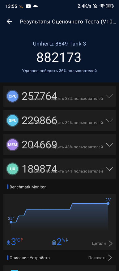 Я всегда вижу защищённые смартфоны, как нечто тяжёлое и не сильно производительное. Сейчас вторая проблема решается за счёт использования процессоров вчерашних средних моделей обычных смартфонов. Если раньше защищенные телефоны набирали до 200 тыс. баллов в Antutu, то сейчас их средний уровень — 400+ тыс. баллов. Использование Dimensity 8200 в обозреваемом, наряду с быстрой памятью UFS3.1, LPDDR5, Bluetooth 5.3, Wi-Fi 6, двуздиапазонного GPS (L1+L5) выделяют 8849 Tank 3 Pro из остальной массы защищённых смартфонов, самый мощный из которых имеет Dimensity 8050 процессор. В такой трактовке Tank 3 Pro — настоящий флагман своего сегмента. На счёт реализации возможностей системы, ее плавности, наличию багов — это свойственно примерно каждому телефону из класса защищённых устройств.