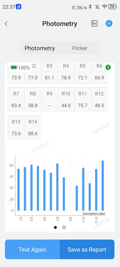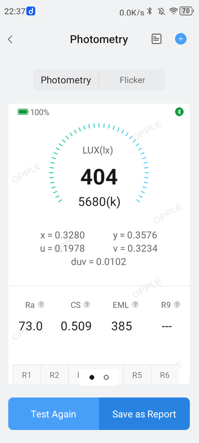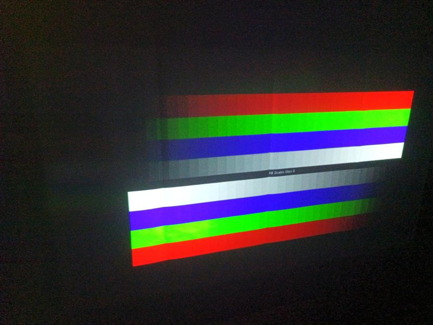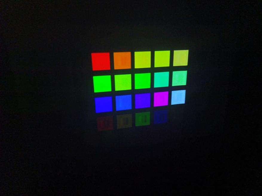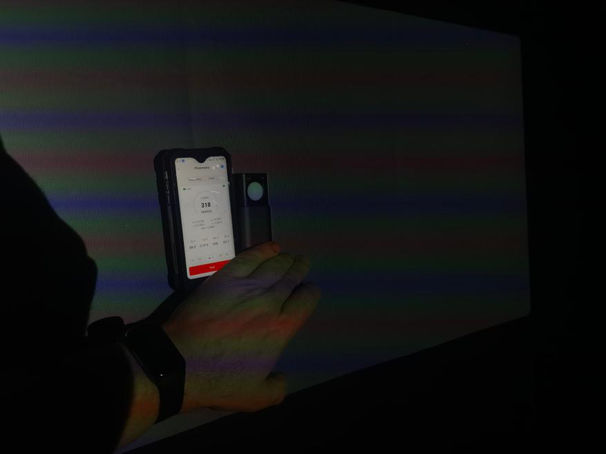 Расположил проектор на расстоянии 1 м до стены с «экраном»: ширина проекции составила 0,9 м, высота — 0,4 м, площадь — 0,36 м², диагональ — 40″. Следовательно, Throw factor — 1,2:1. Offset при этом составил 50%. Шум оценивается в 50 дБ, что много. При просмотре его практически не слышно. Пример оценки по центру показан выше, ниже — результаты по индексу цветопередачи Ra, Duv, температуры на кривой BBL, модуляции и осцилляции. По показателю throw factor обозреваемый лучше, чем предыдущая модель: 1,2:1 против 1,4:1, соответственно. Такое различие будет заметно ниже в сравнении проекций с двух смартфонов.