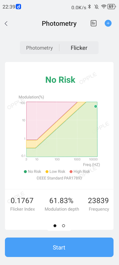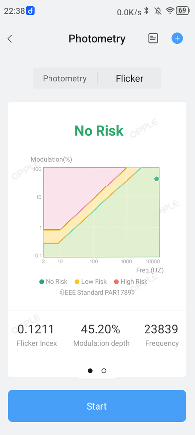Минимальный режим. Температура — 5668К, Duv больше 0,004 (изменение оттенков освещаемых предметов заметно), низкий показатель индекса цветопередачи Ra (хорошим считается уровень, больший 90), модуляция в «зелёной зоне».