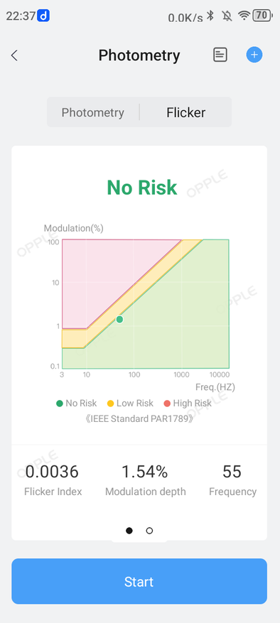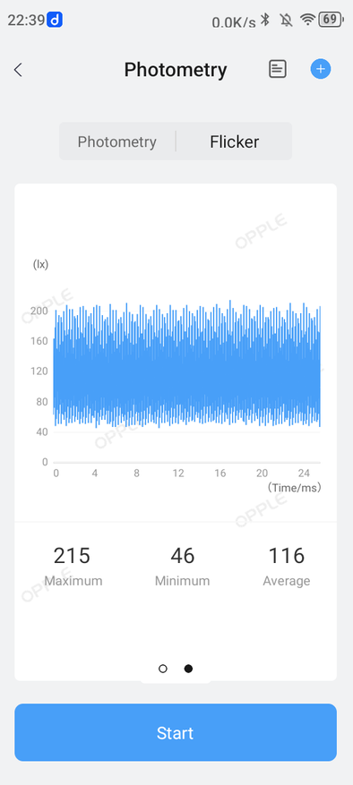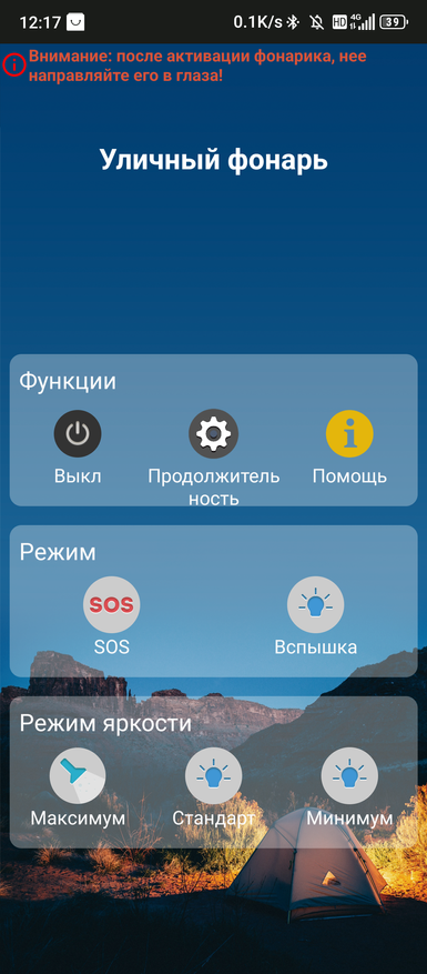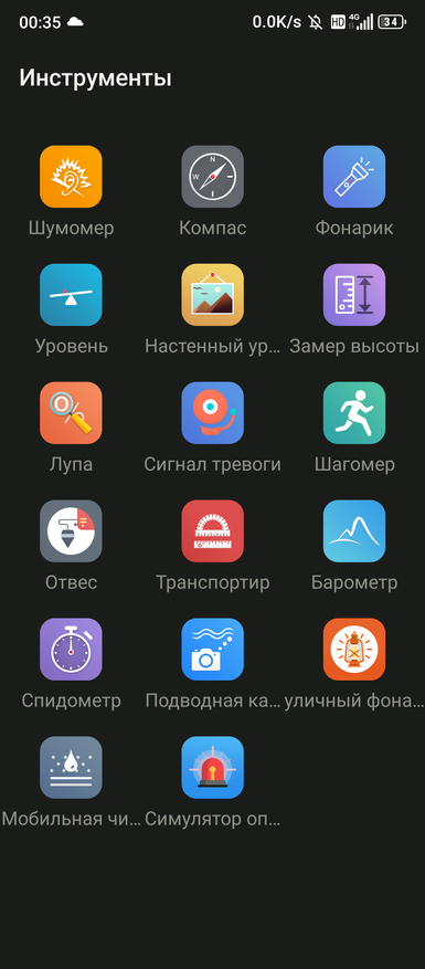 Программа «Фонарь» находится в «Инструментах». Там же можно найти и стробоскопы под названием «Симулятор оповещений». Далее будут показаны результаты оценки трёх режимов свечения фонаря. Оценка производилась в темной комнате на расстоянии в 70 см до Opple Light Meter 4.