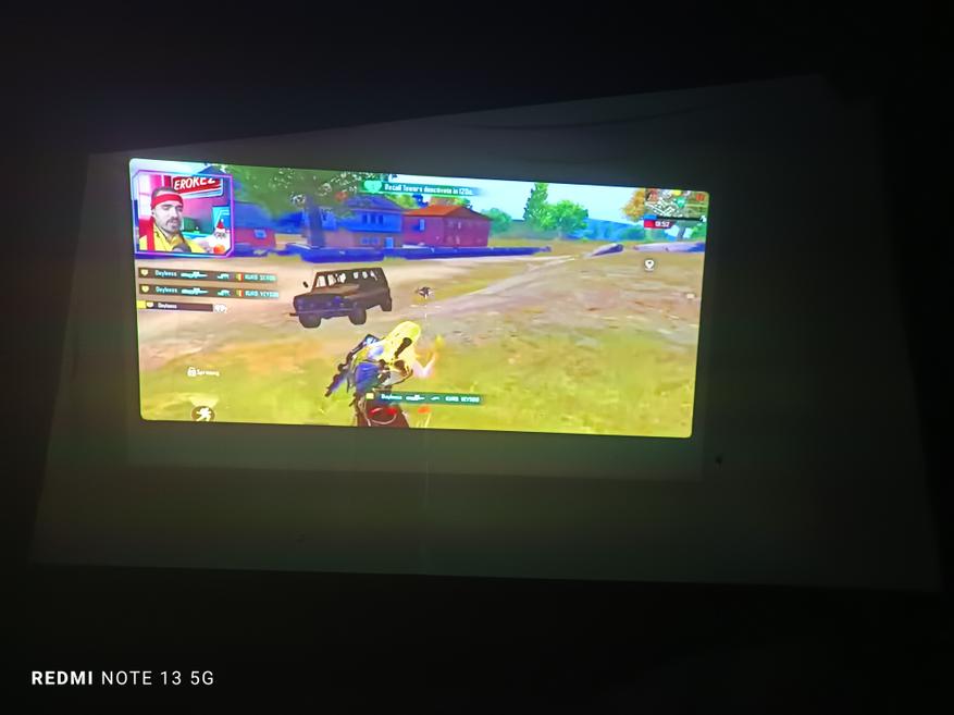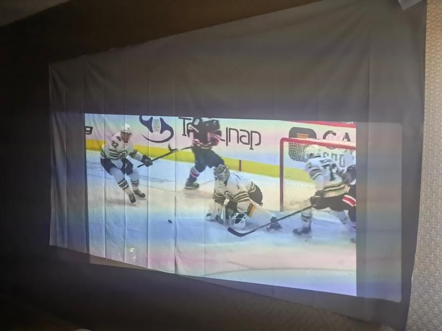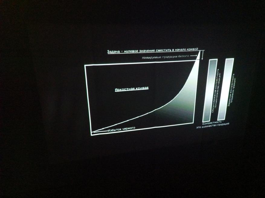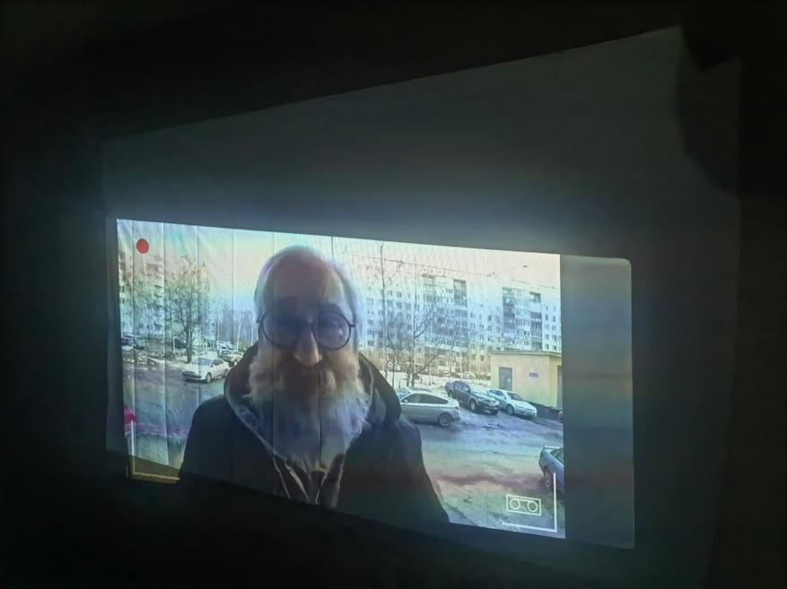 При выключенном свете куда лучше и приятнее смотреть на проекцию. Я положил телефон под углом, система автоматически выровняла картинку. Если бы была ручгюная настройка углов, то можно было бы подровнять ещё.