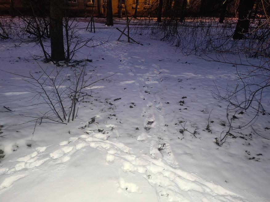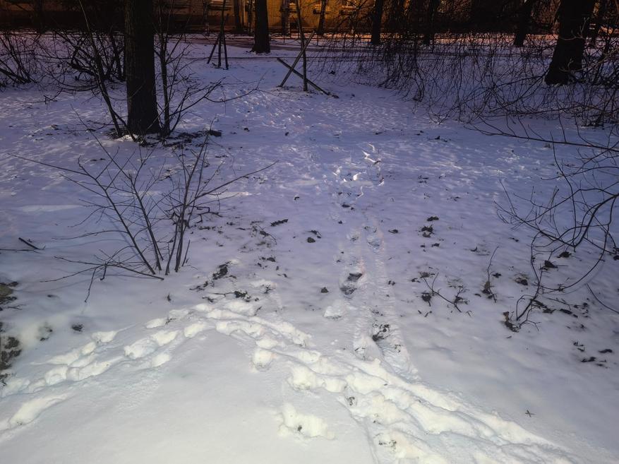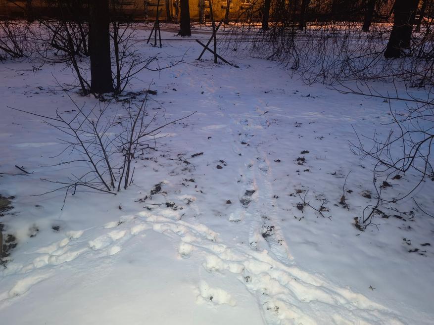 На следующей фотографии показан вид на вечернний заснеженный участок дороги. Далее он будет освещен фонарем в разных режимах.