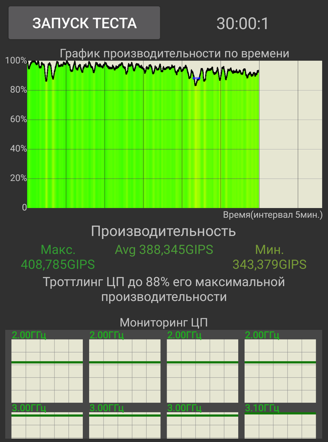 Ниже показан результат теста на троттлинг процессора на 100 потоках в течение 30 минут.