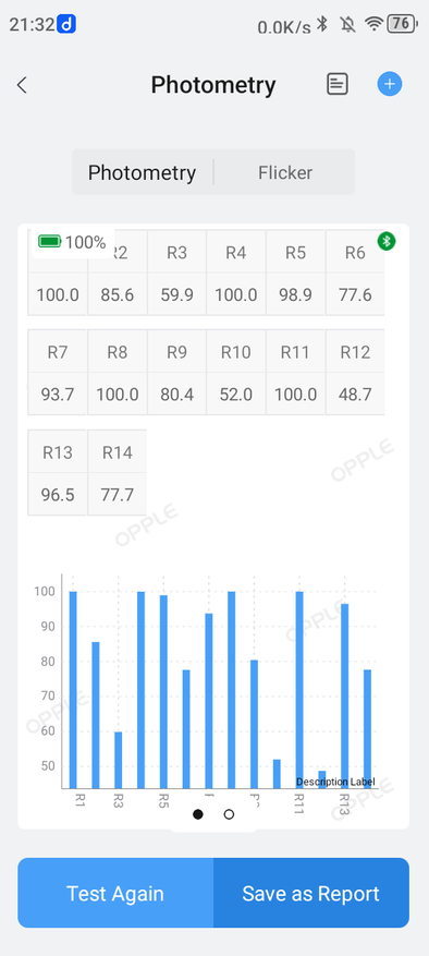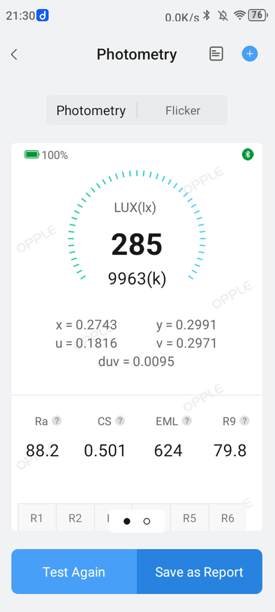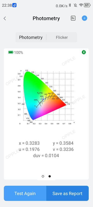 Средний режим. Температура — 5574К, Duv больше 0,004 (изменение оттенков освещаемых предметов заметно), низкий показатель индекса цветопередачи Ra (хорошим считается уровень, больший 90), модуляция в «зелёной зоне».