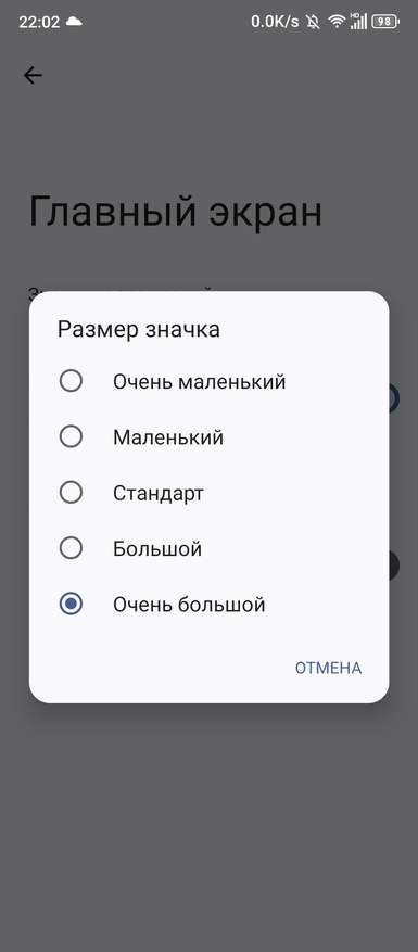 Вид меню, иконок, текста можно настроить под себя. Доступно 5 вариантов их размера. На следующих трёх скриншотах показаны «Очень маленький», «Стандартный» и «Очень большой» размеры приложений.