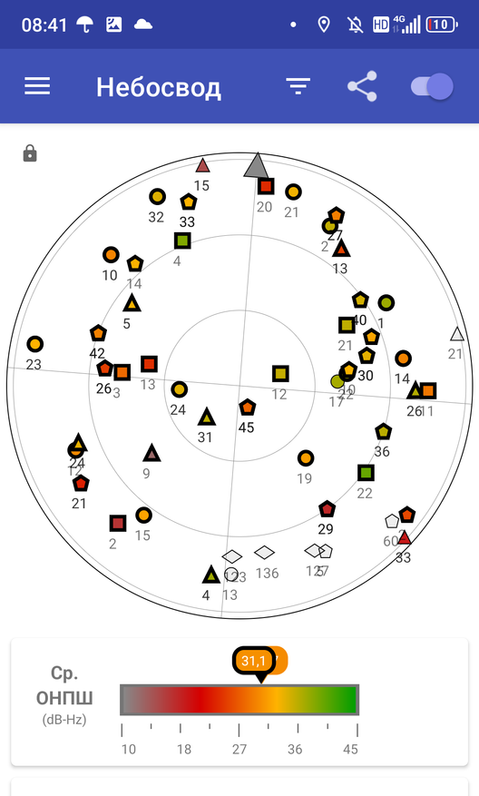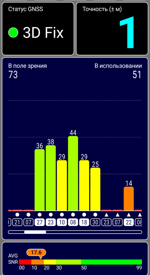Тест на спутники у обозреваемого товара — основной и важный. Такое определение вытекает из того, что GPS у Tank 3 — двухуровневый, L1 и L5. Подобное есть в хороших брендовые моделях. Экран защищённого смартфона — преимущество при навигации, которое надо использовать. Местоположение определяется быстро и точно, до 1 м на открытом пространстве: видно 85 и используется 72 спутника (это в пасмурную погоду) разного уровня уровня, в частности от таких систем, как: BeiDou, Galileo, GPS и ГЛОНАСС. Всё соответствует заявленному в характеристиках.
