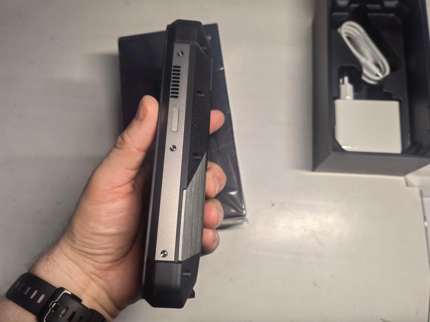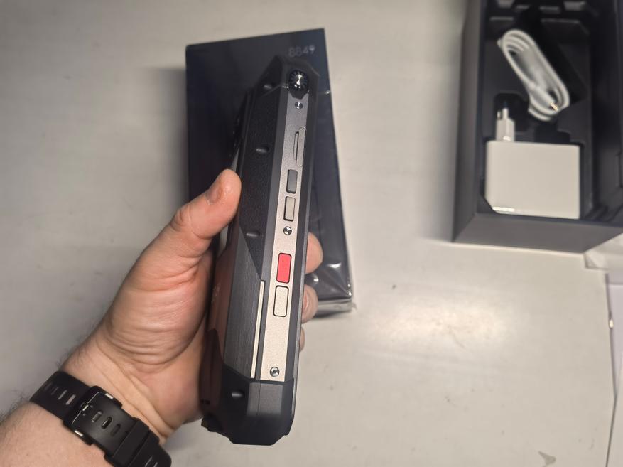 Расположение кнопок в телефоне не совсем привычное. Кнопки включения и громкости находятся немного выше центра справа и слева, соответственно. К их расположению и использованию привыкаешь. Внутренний накопитель в 512ГБ можно расширить за счёт microSD карты до 2ТБ, не отказывая себе в использовании двух нано сим одновременно. Тройной сим-лоток в смартфонах 8849 — это отличительная черта бренда. Есть исключения, их два — это Unihertz Tank и 8849 Tank Mini 1. В моделях других защищённых брендов чаще встречается комбинированный сим-лоток. К примеру можно отнести смартфон Blackview BL9000 (обзор здесь), который работает под управлением Dimensity 8020 и имеет лоток на два предмета, а не три, как у обозреваемого. В плане тройного лотка под сим карты и карту памяти, бренд 8849 слушает и соответствует запросам пользователей, как минимум пока.