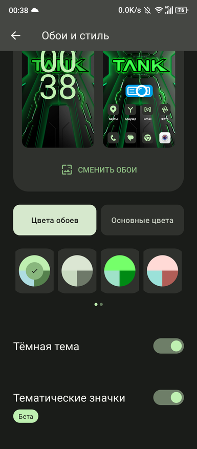 Доступ к настройкам вида рабочего стола осуществляется через соответствующий пункт меню «Обои и стиль» или через удержание свободной области экрана. Есть экспериментальный вид меню, но, на скриншоте показано, не все иконки будут иметь уникальный вид. Пока данная область меню находится в разработке. В качестве системного языка можно выбрать русский язык.