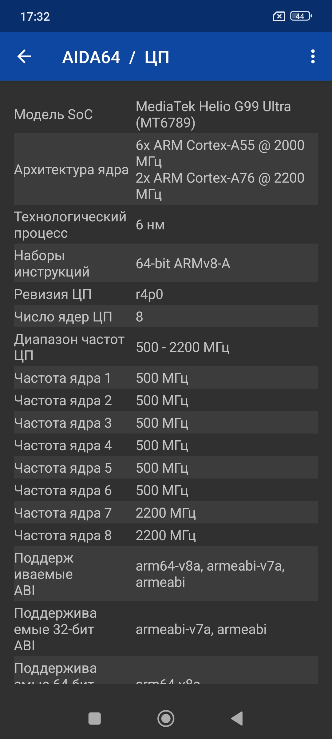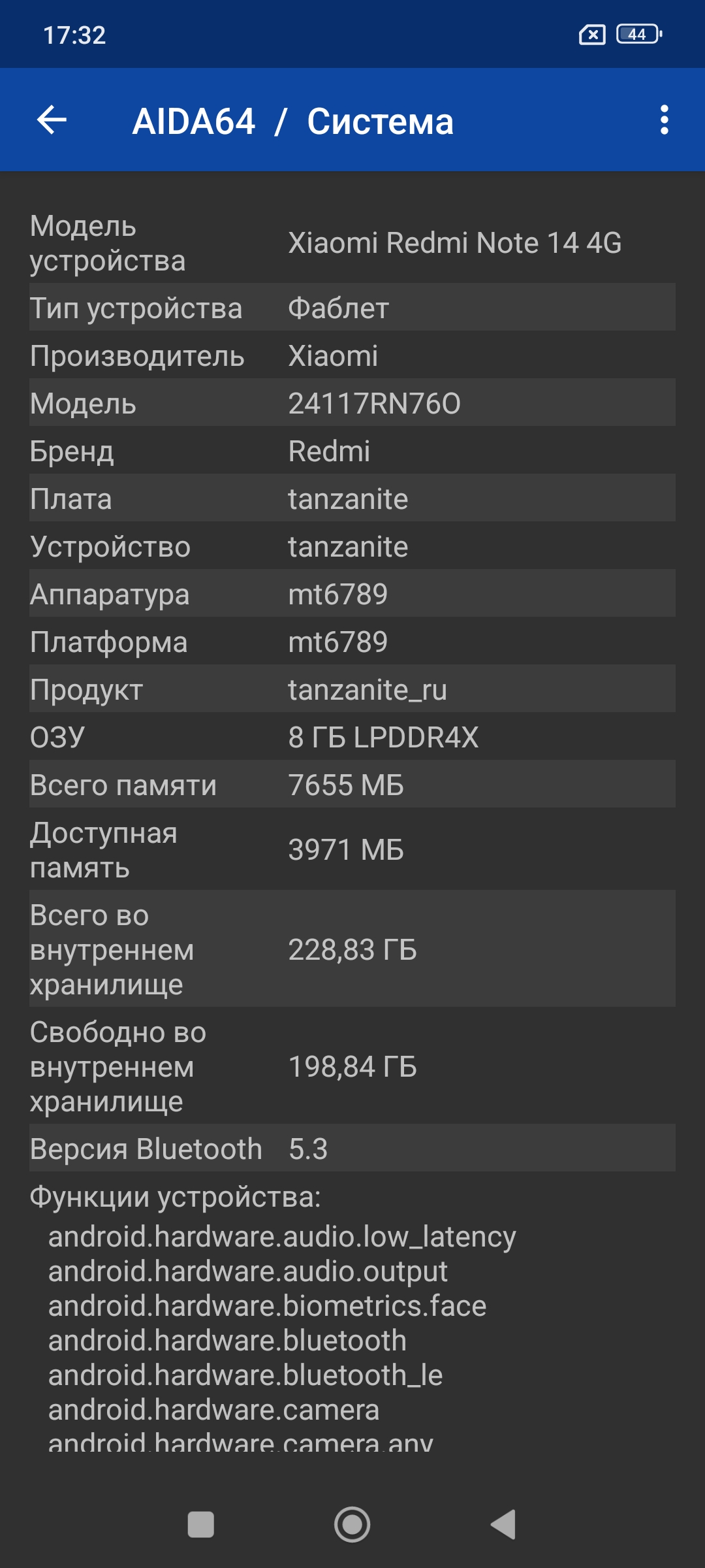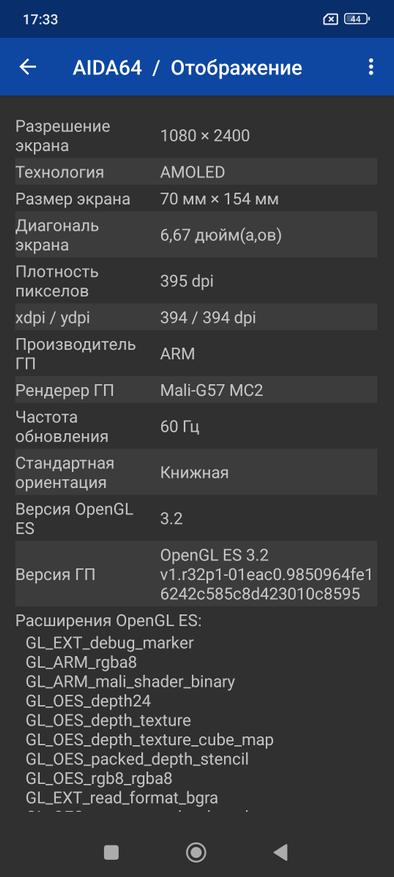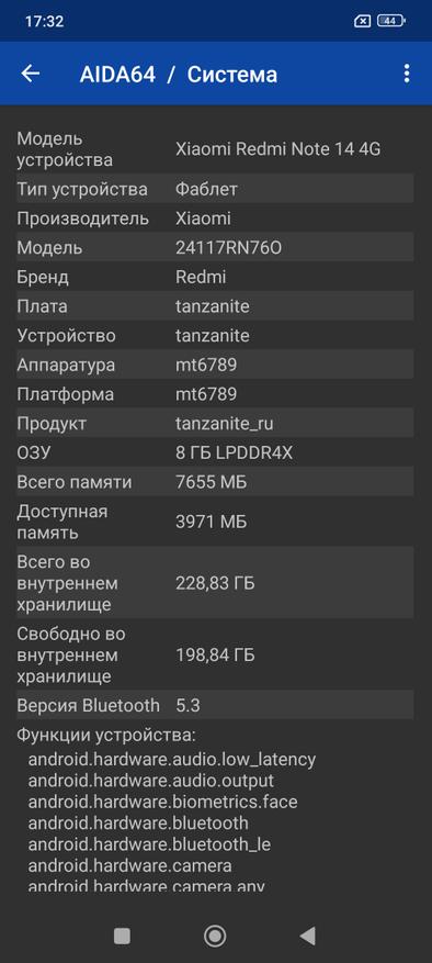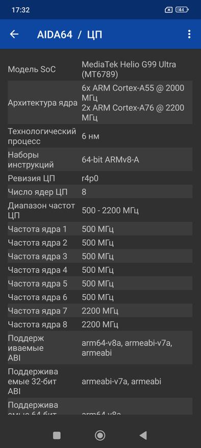 Познакомимся с заявленным железом более подробно, а для этого прогоним Aida64. Скриншот Aida сделал пару дней назад, тогда еще была операционная система Android 14. Все компоненты смартфона определяются в соответствии с заявленными производителем.