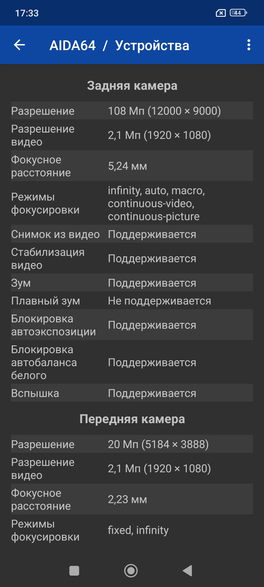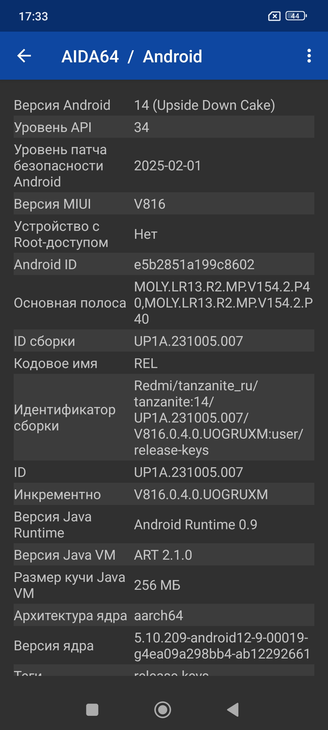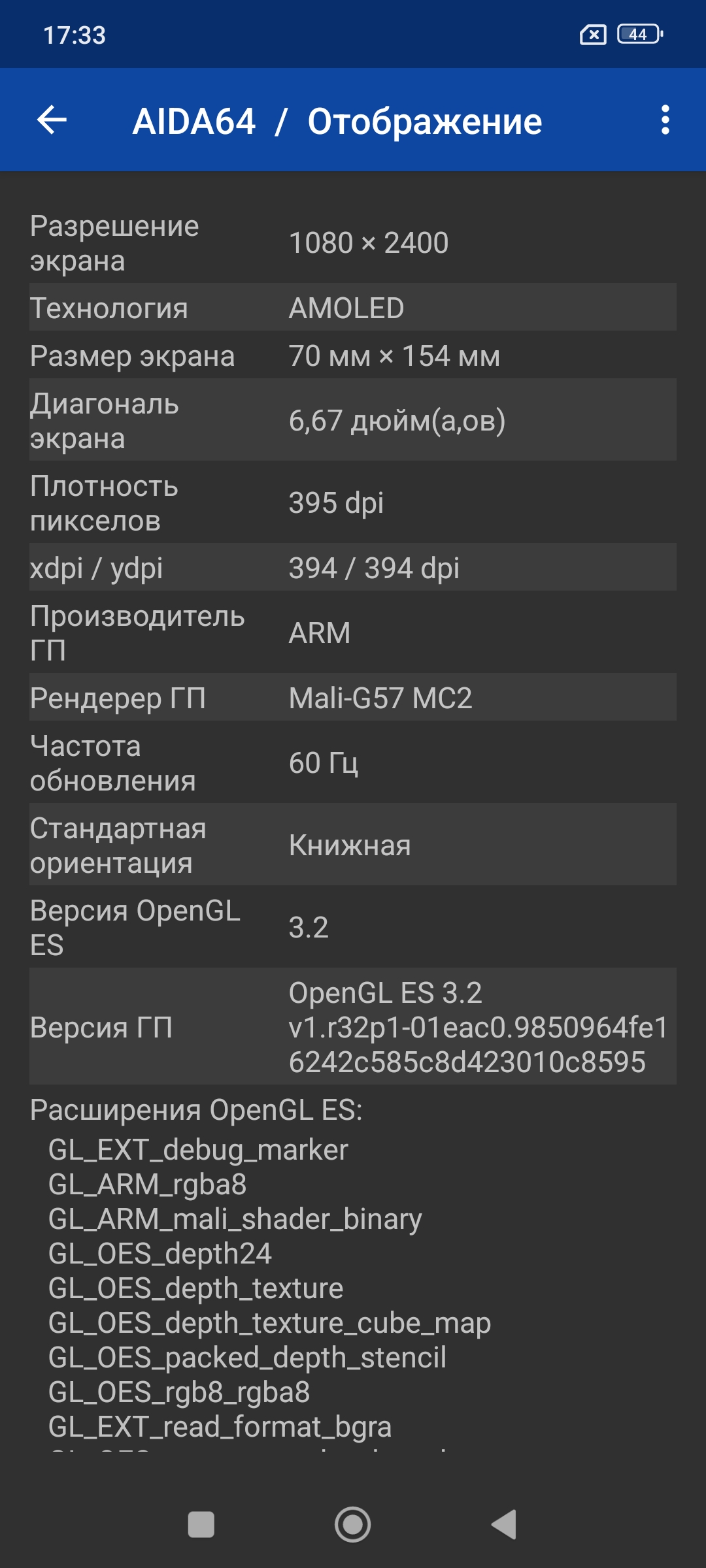 Познакомимся с заявленным железом более подробно, а для этого прогоним Aida64. Скриншот Aida сделал пару дней назад, тогда еще была операционная система Android 14. Все компоненты смартфона определяются в соответствии с заявленными производителем.