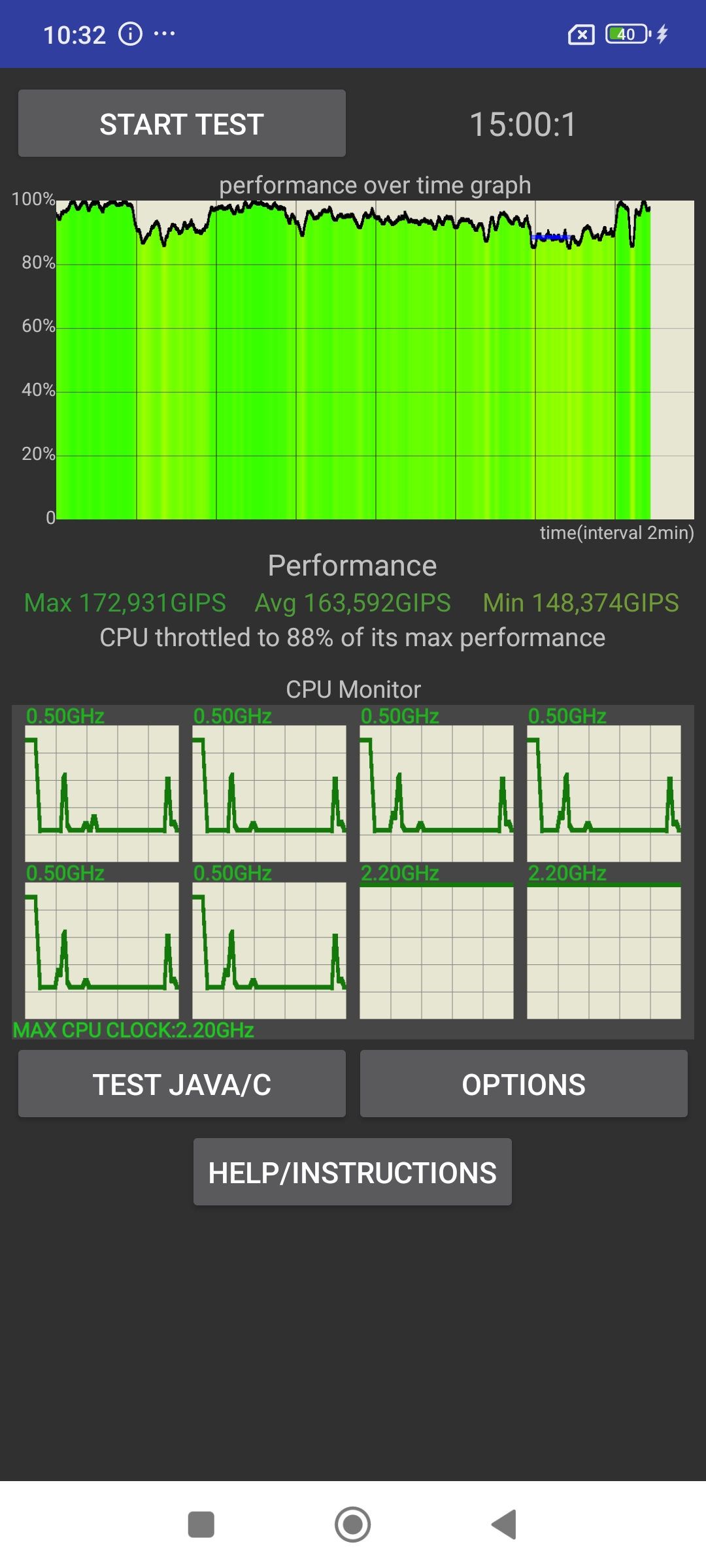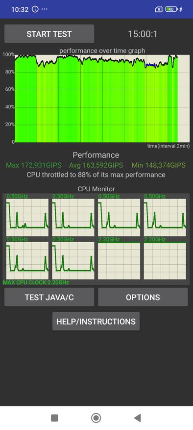 Тест нагрузки процессора смартфон выдерживает без видимых провалов. За 15 минут есть незначительный нагрев корпуса, но это не повлияло на производительность. Процессор уже многократно проверенный в работе и частенько используется в бюджетных гаджетах.
