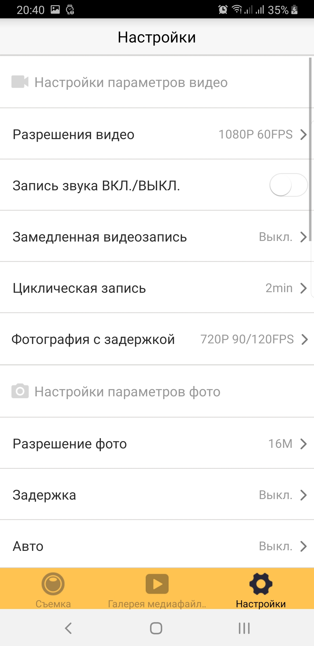 Что касается общих настроек устройства, есть в них функция поворота изображения в зависимости от положения камеры (горизонтально либо вертикально), функция авторегистратора, задержка выключения устройства, время блокировки экрана и др.