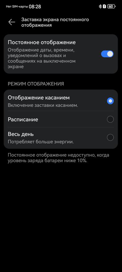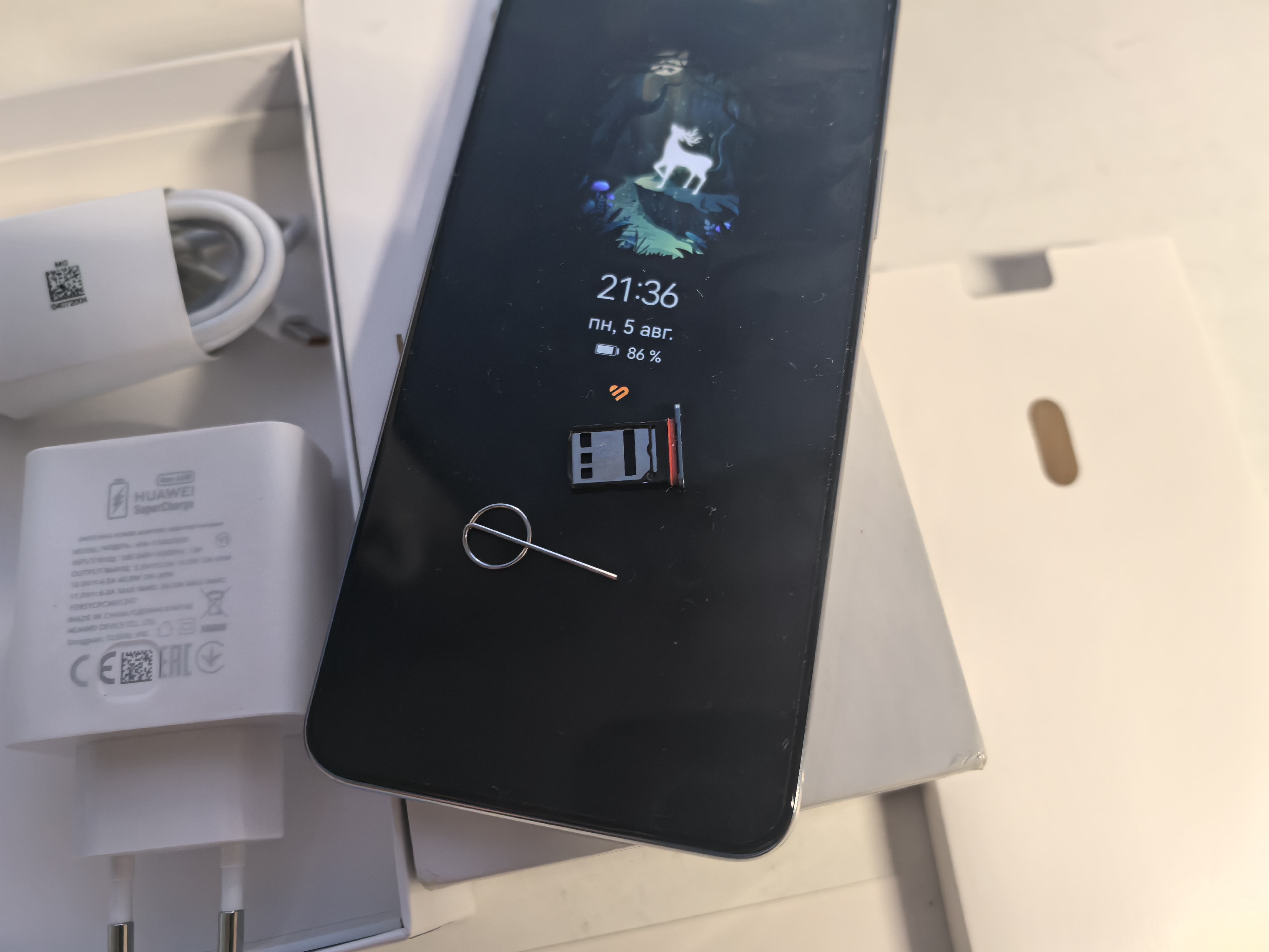 Модель приятно держать в руках. Корпус — пластик, но нет ощущения дешевизны. На OLED-экране есть AOD, но на постоянное отображение его поставить нельзя. В телефонах HUAWEI я этой опцией никогда не пользуюсь, так как при взгляде или движении телефона экран загорается автоматически. Для меня — это аналог индикатора событий. В настройках можно назначить включение экрана при поступлении уведомлений.