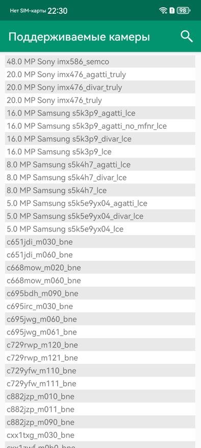 Телефон ещё выделяется селфи-камерой. Ее разрешение — 32МР. Определить, какой это сенсор не получилось, как и два других у 8МР широкоугольной и 2МР у макро камер. Программа HW Device Info выдала очень много возможных вариантов.