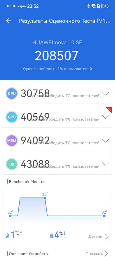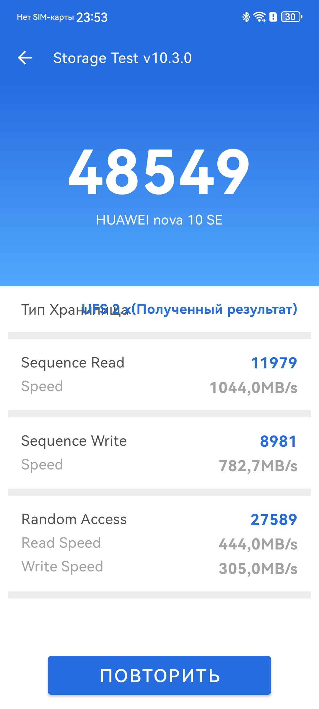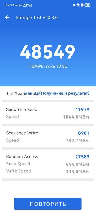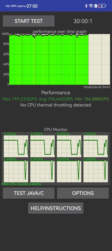 Интересно было понять именно по тестам, как позиционируется телефон относительно конкурентов на рынке. В Antutu он набирал у меня 208507 баллов. По поиску говорится, что его значение — 250000 баллов. Это примерно соответствует процессору Unisoc T616, но по отклику системы процессор у обозреваемого не сравнится с названным. Скорость случайных чтения и записи — большая, проблем с записью информации не будет. Поддерживается до 10 касаний экрана одновременно. По результатам троттлинг теста за 30 минут на 100 потоках среднее значение — 196443 балла.