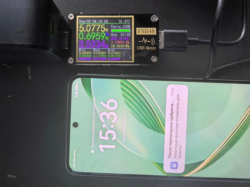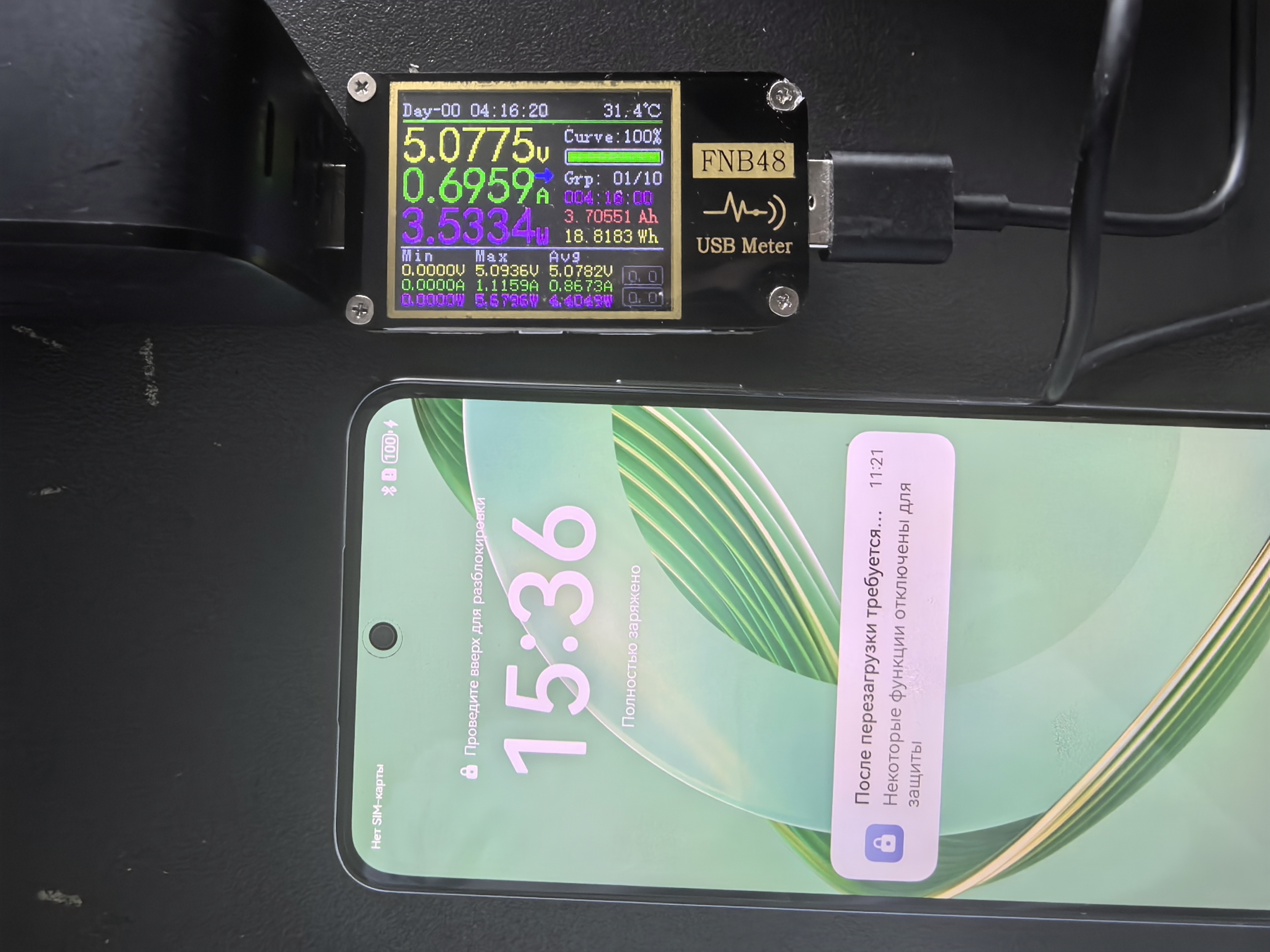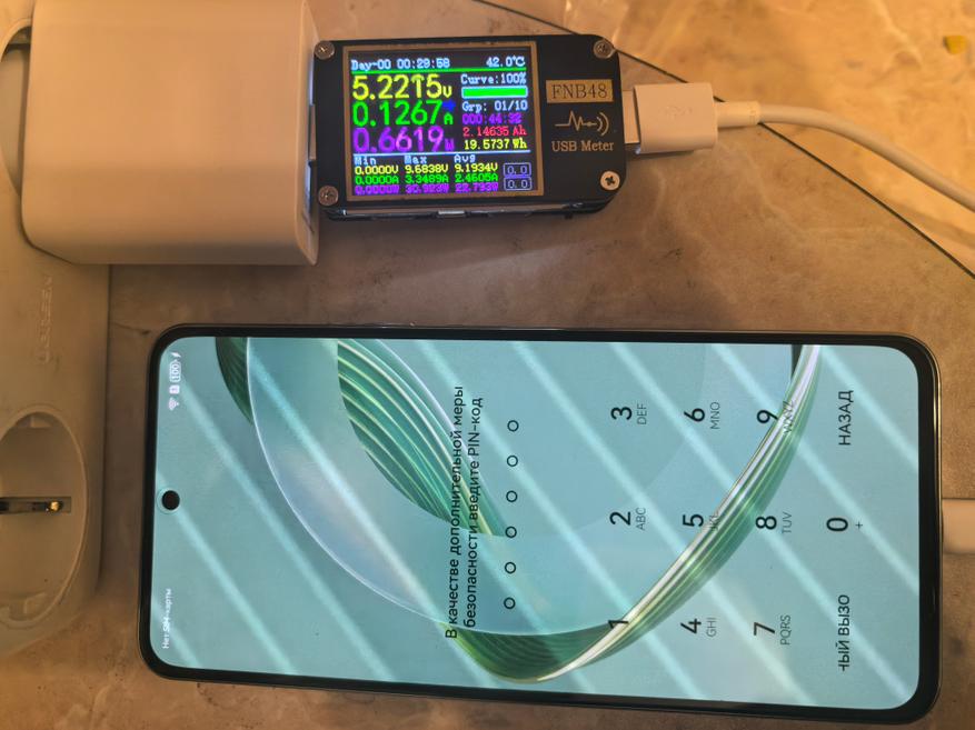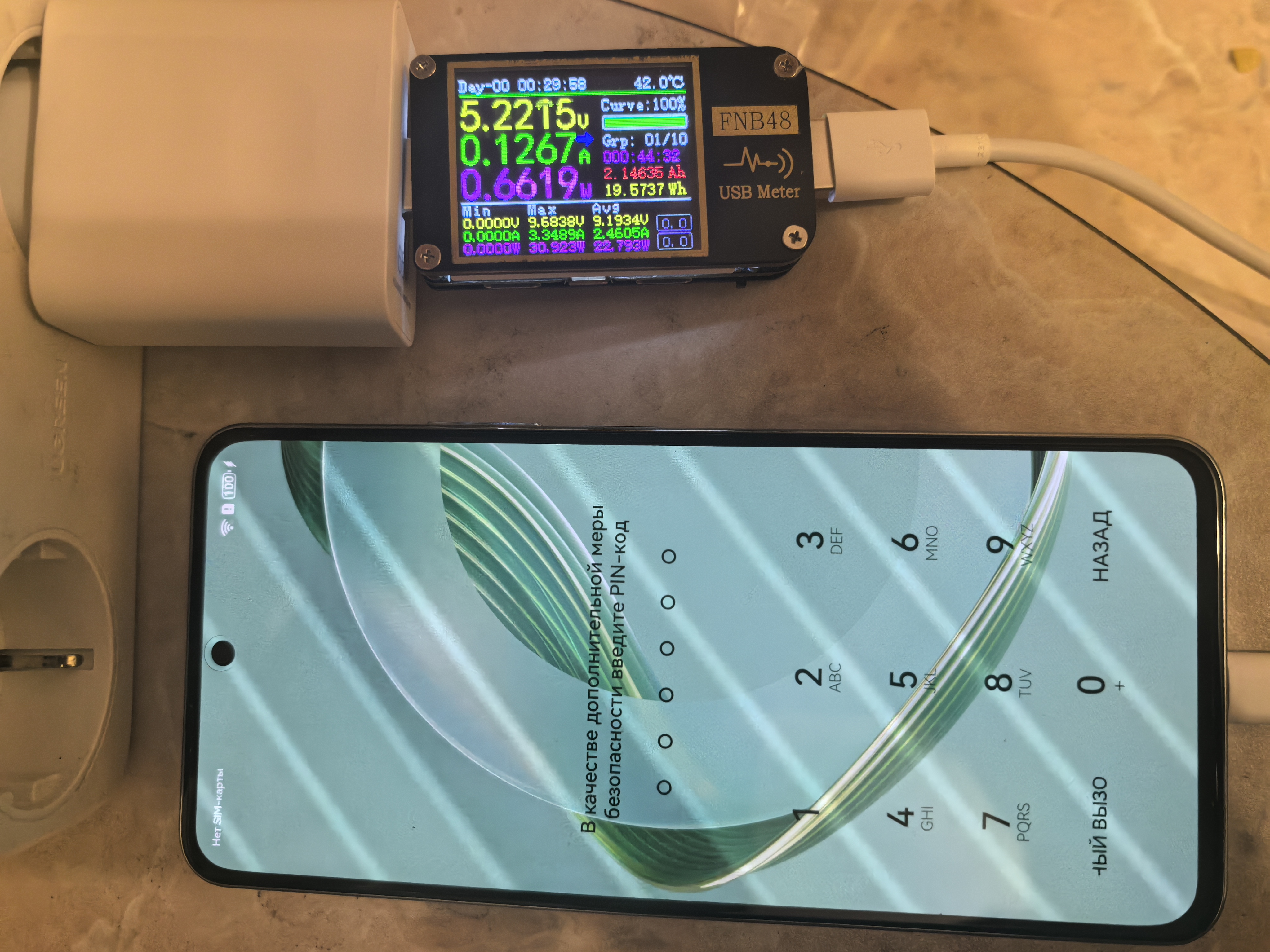 Через USB-A некомплектных ЗУ и кабеля процесс длится 4,3 ч и составляет 3706mAh (18,8Wh). Через USB-C также некомплектных ЗУ и кабеля восполнение энергии проходит быстрее, за 1,75 ч на 2221mAh (20,2Wh). В первом случае максимальная мощность составляет 5,5W, во втором — практически в три раза больше, 17,1W.