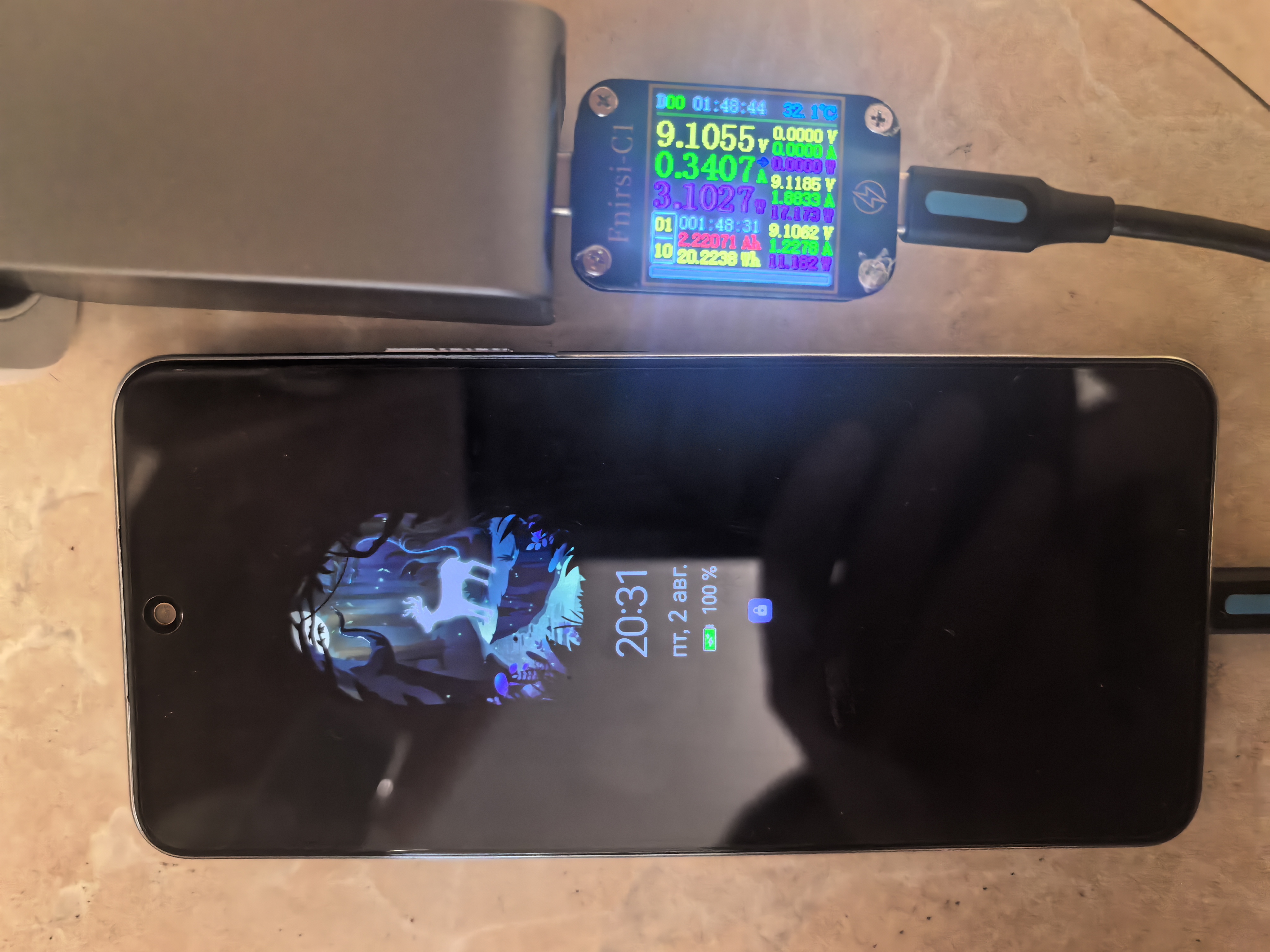 Если заряжать Nova 12SE через комплектное зарядное устройство, то мощность составит 66Вт, процесс будет длиться 44 мин с 2146mAh (19,6Wh). Если заряжать от стороннего, то лучше через USB-C USB-C кабель, так как в моем случае процесс закончился в два раза быстрее, чем через USB-A USB-C. Ниже на фотографиях привел результаты заряда от одного и того же ЗУ Ugreen Nexode Pro X757 (CD357) (обзор здесь), но от разных выходов.
