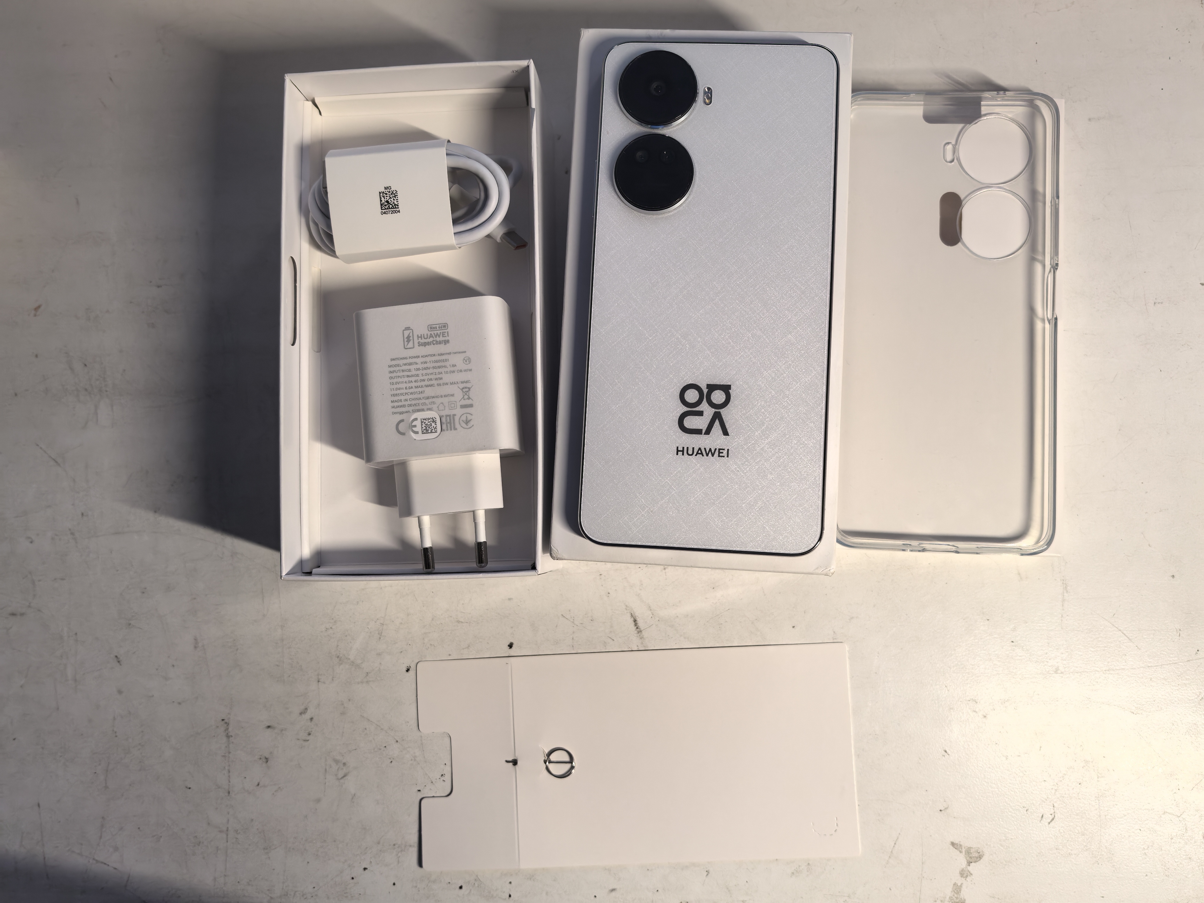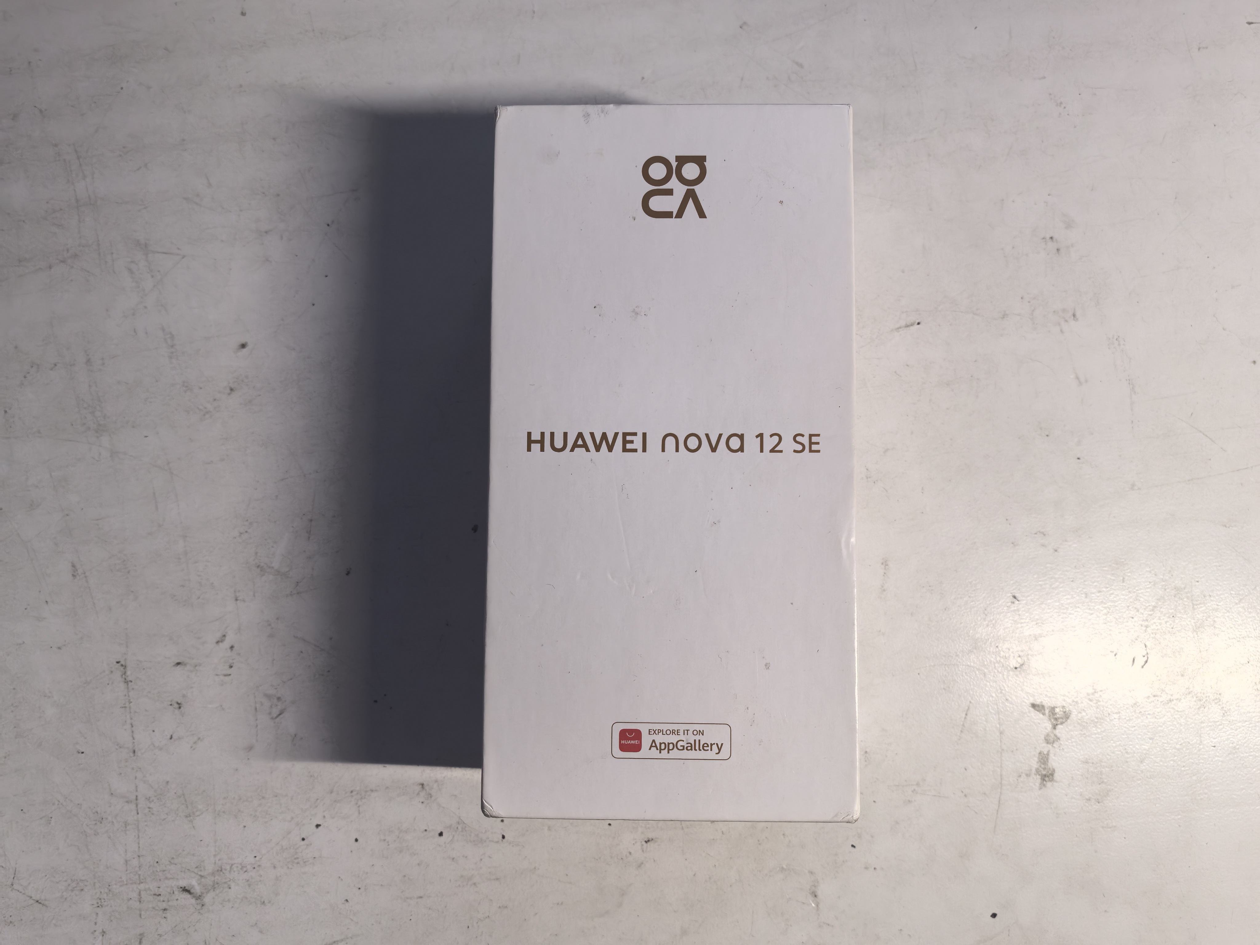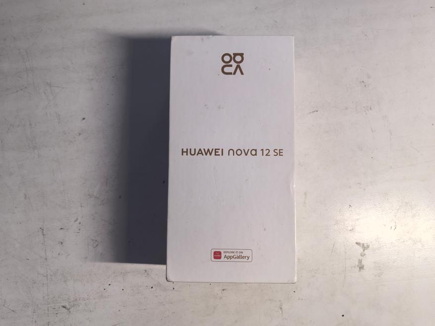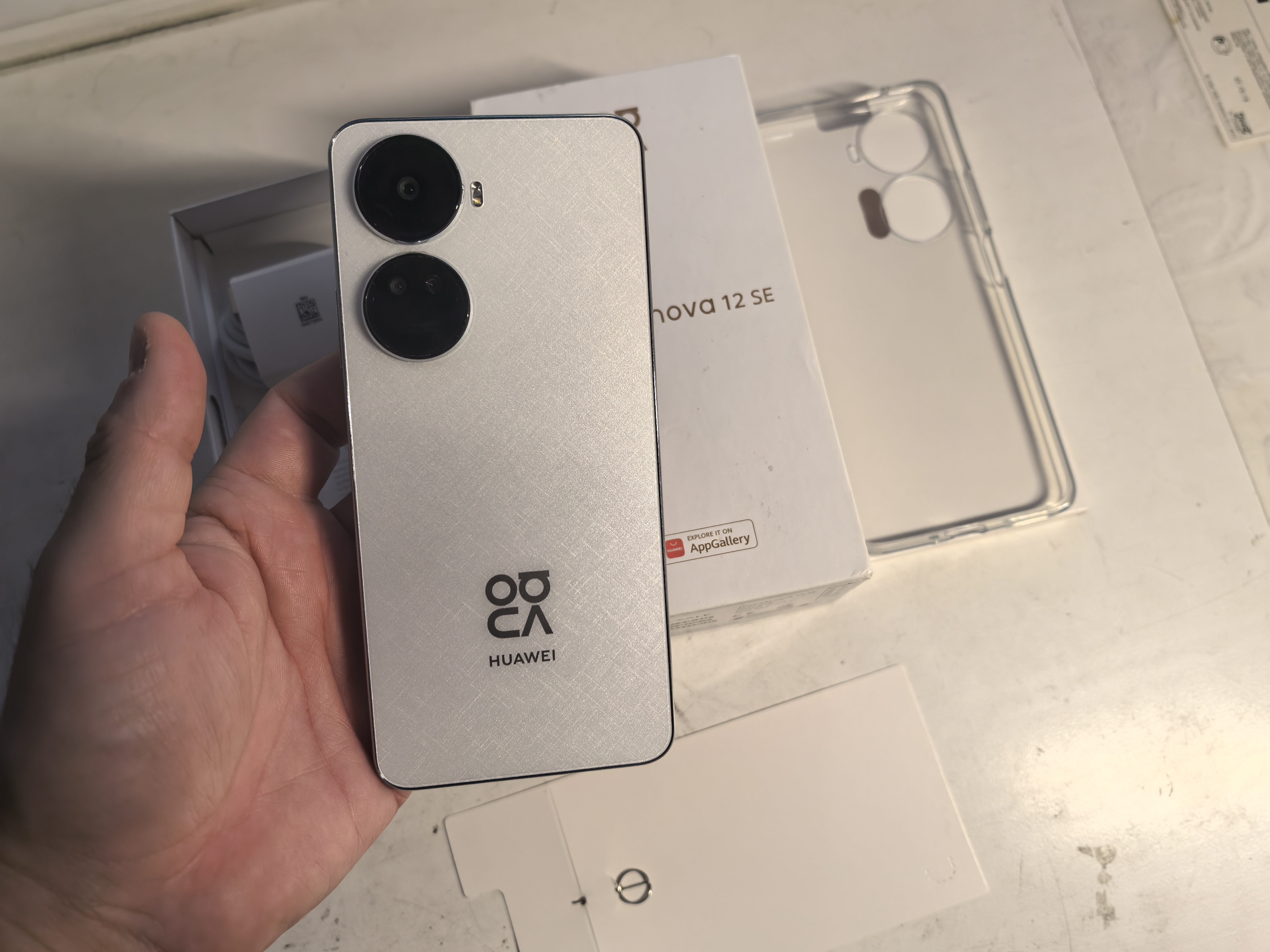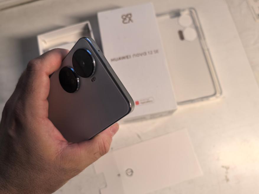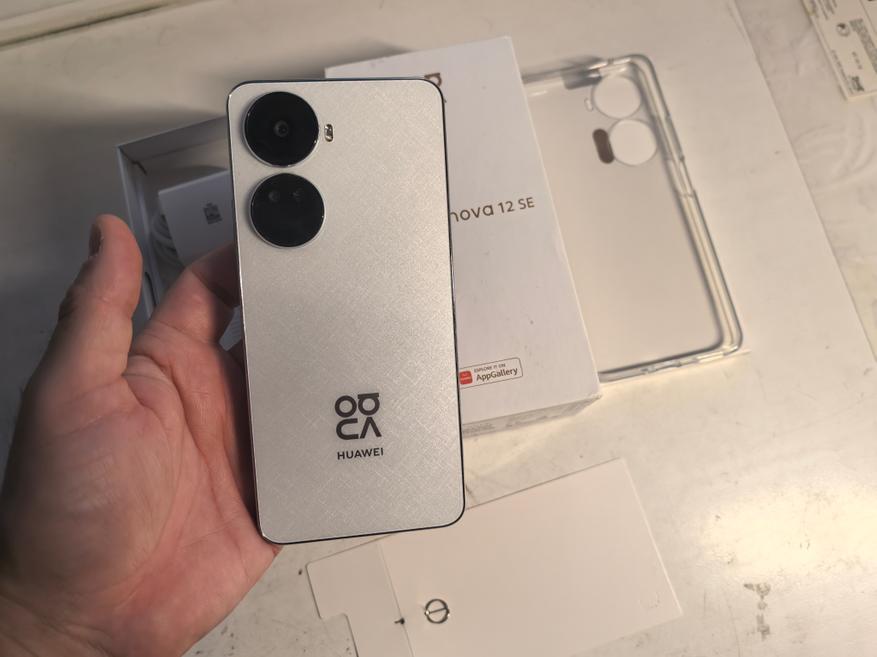 Смартфон находится в белой коробке. Внутри в защитной обертке лежит модель экраном вверх. На второй фотографии я эту обёртку снял и перевернул телефон. Представление камерного блока с двумя кругами, лично для меня, напомнило HUAWEI P50 Pro. Ещё одна аналогия с названым — скорость заряда. На этом сходства заканчиваются, но уже хорошо, что Nova 12SE не копия iPhone.
